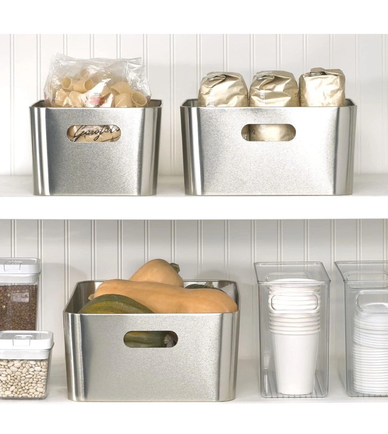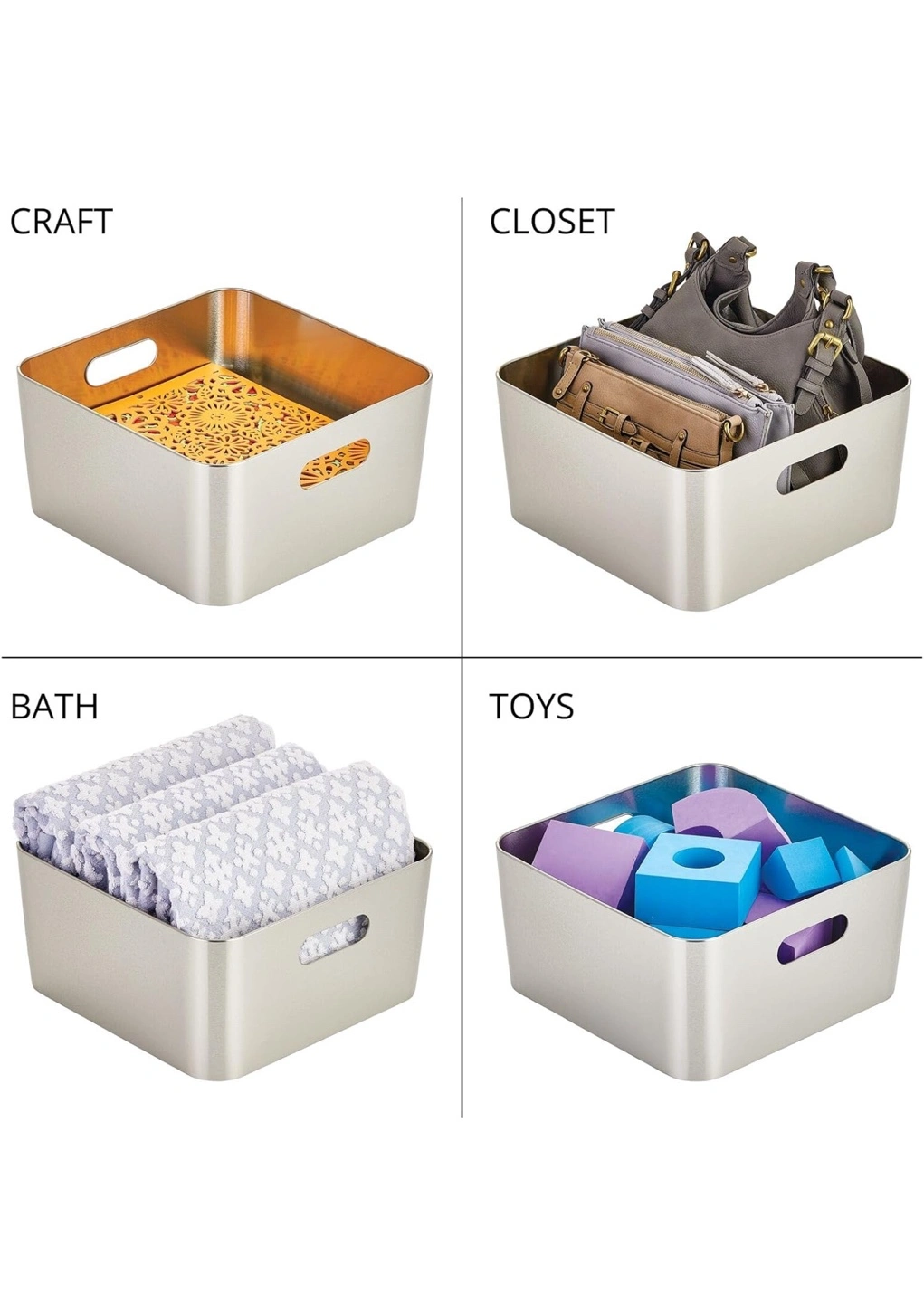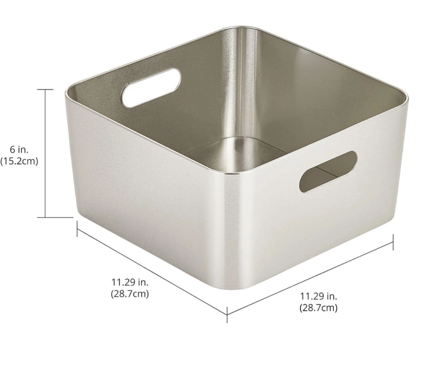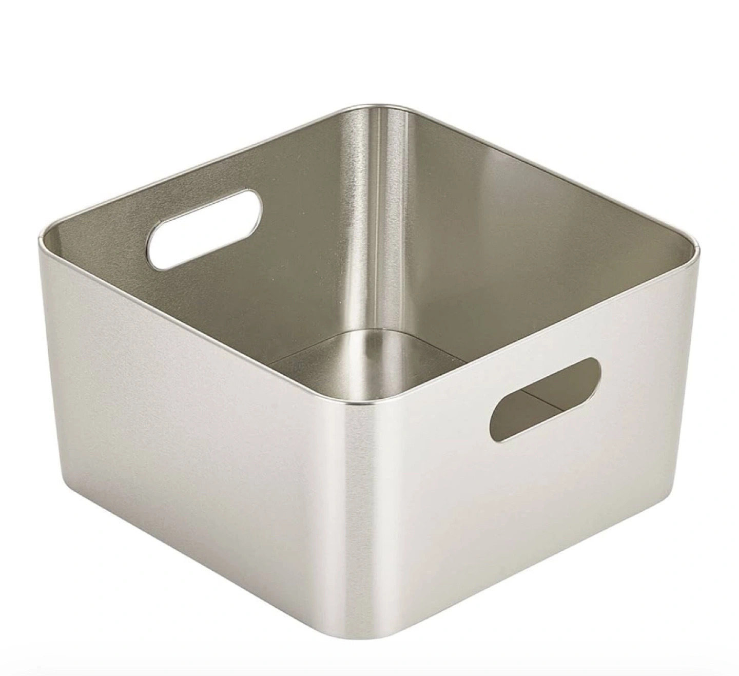 New Silver metal storage containers. Square shape. Cut-out handles on sides. Organize pantry, closet, or bathroom. Durable and stylish.