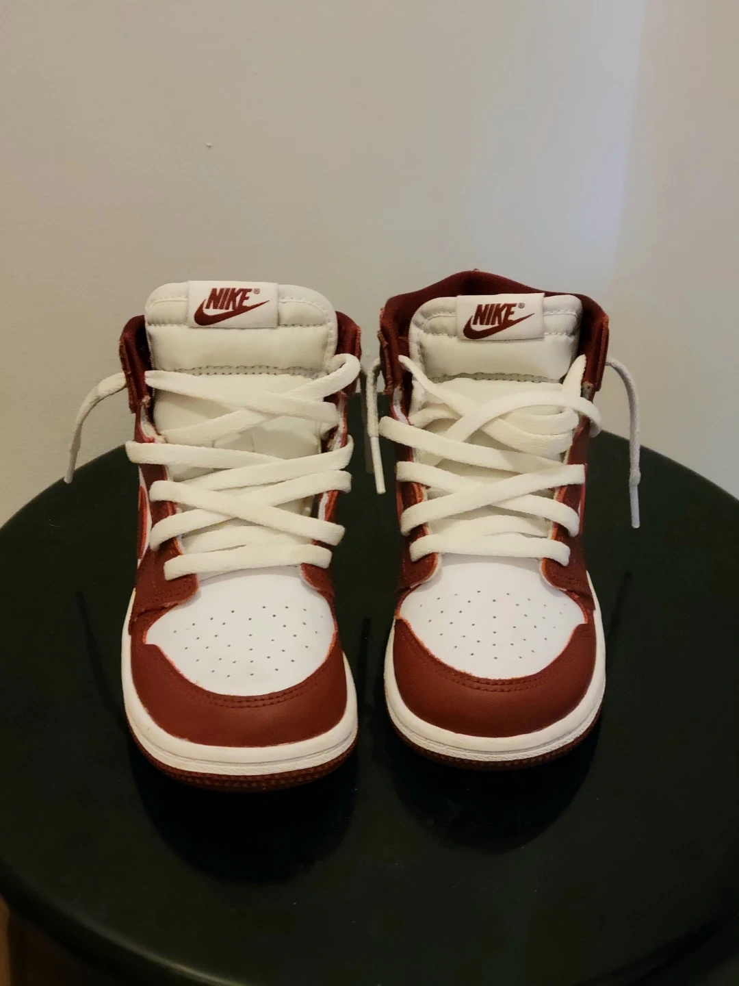 These Nike Air Retro Jordan 1 Mid sneakers are in a classic white and burgundy colourway. They feature a lace-up closure and iconic Jordan branding. Perfect for everyday wear! Son only wore once for his birthday. Size 10