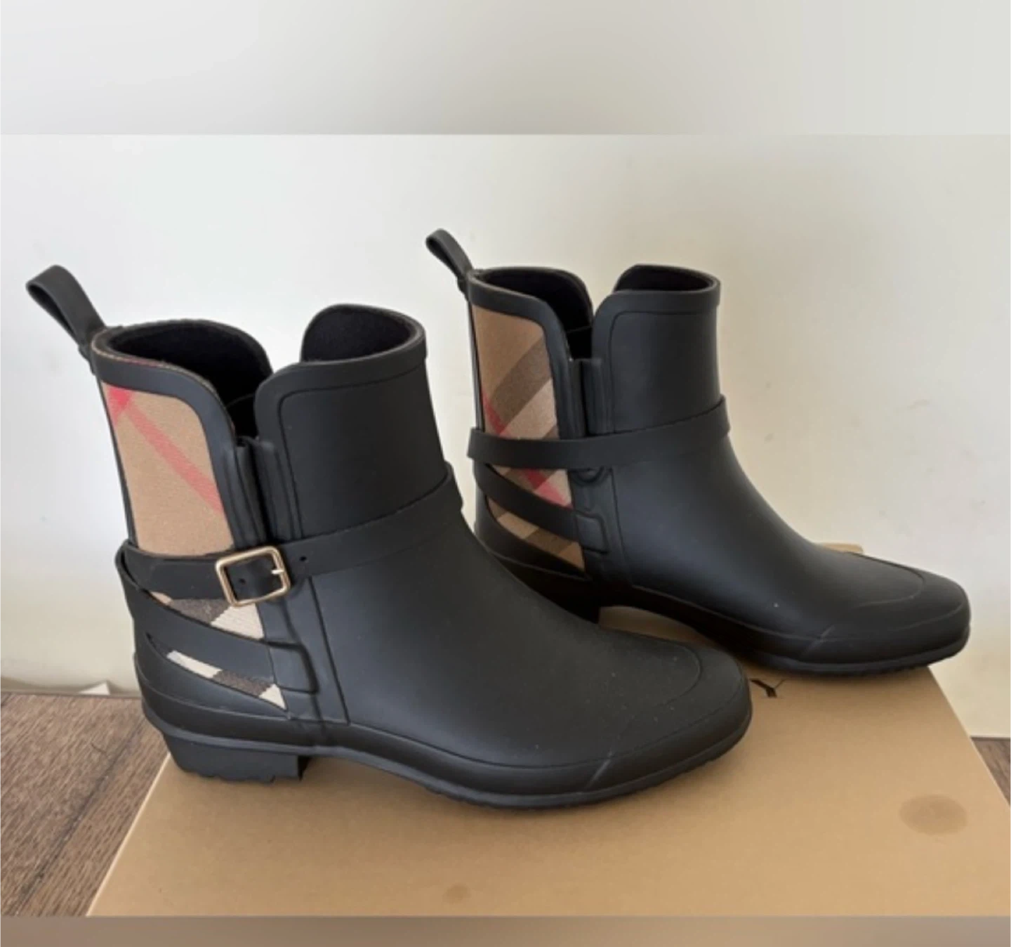Burberry black rubber rain boots. Features the iconic House Check detail on the ankle strap and back tab. Buckle closure for adjustable fit.