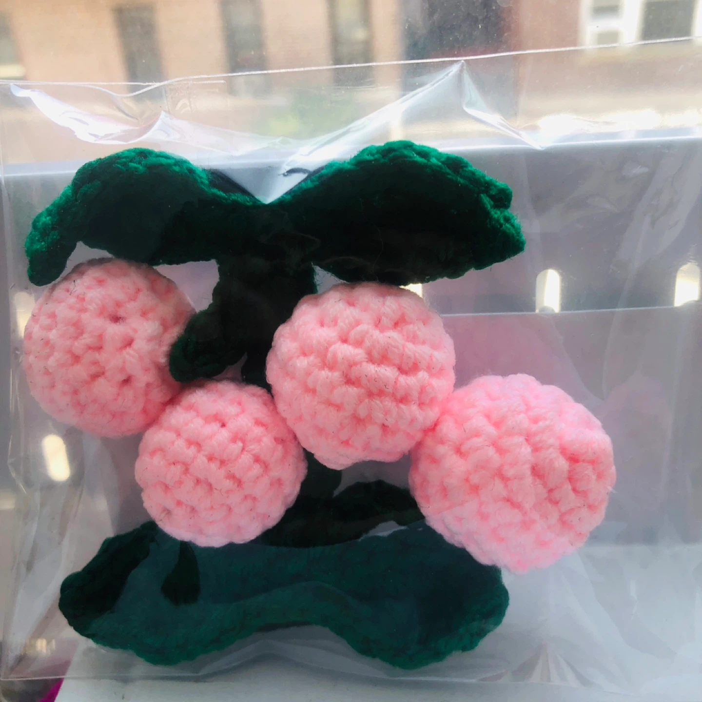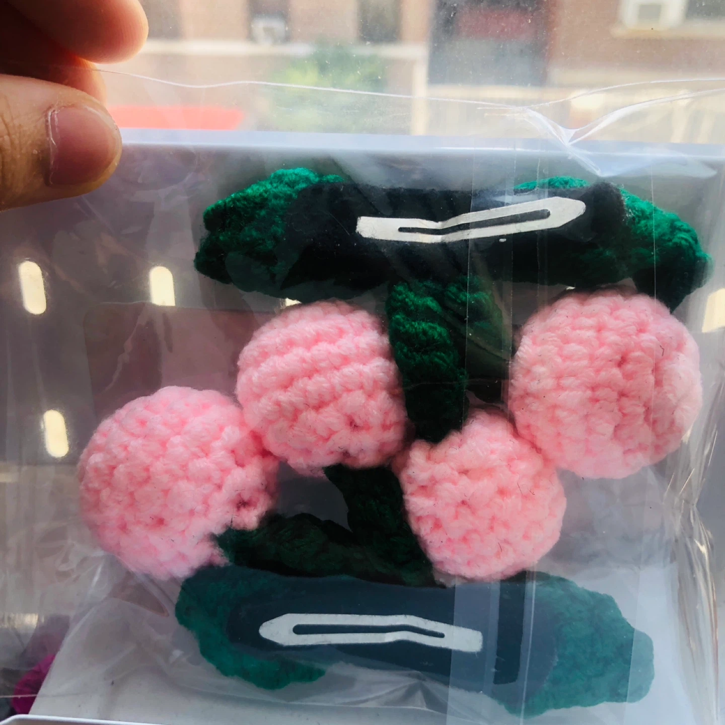 Set of two cute crocheted cherry hair clips. Each clip features a cluster of pink cherries with green leaves. Easy to attach for a playful look!