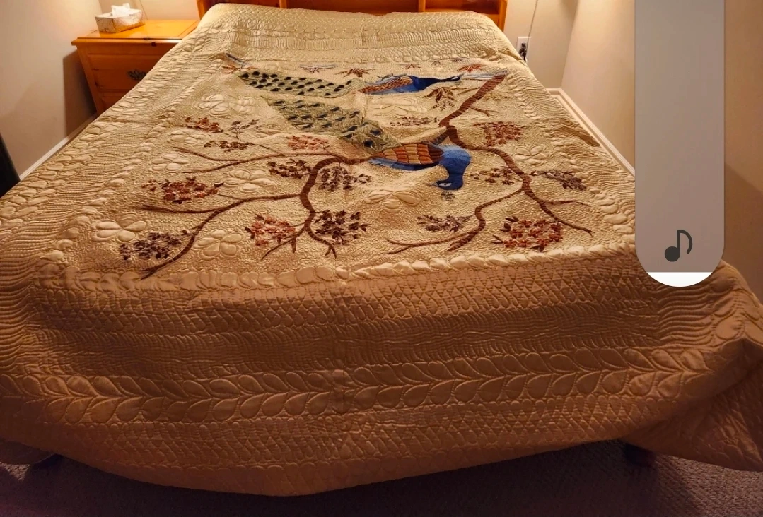 Beautiful quilted bedspread featuring a peacock and tree branch motif. Intricate stitching throughout adds texture and detail. Adds a touch of elegance to any bedroom!