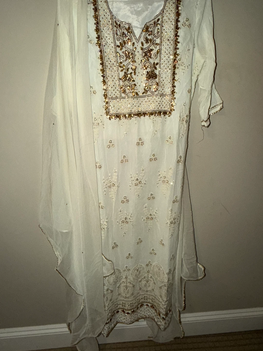 Beautiful white and gold Indian dress. Has intricate embroidery on neckline, sleeves, and bottom hem. Comes with matching sheer dupatta with gold trim. Great for parties or special events. It comes with bottom white color pants. I have just worn it for few hours on an occasion never worn after that. Dry cleaned and kept.