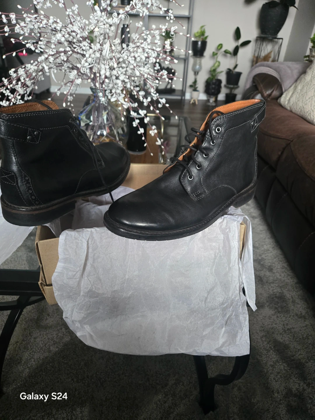 These Clarks chukka boots are made with black leather. They have a lace-up closure and a durable sole. A great casual boot for everyday wear!