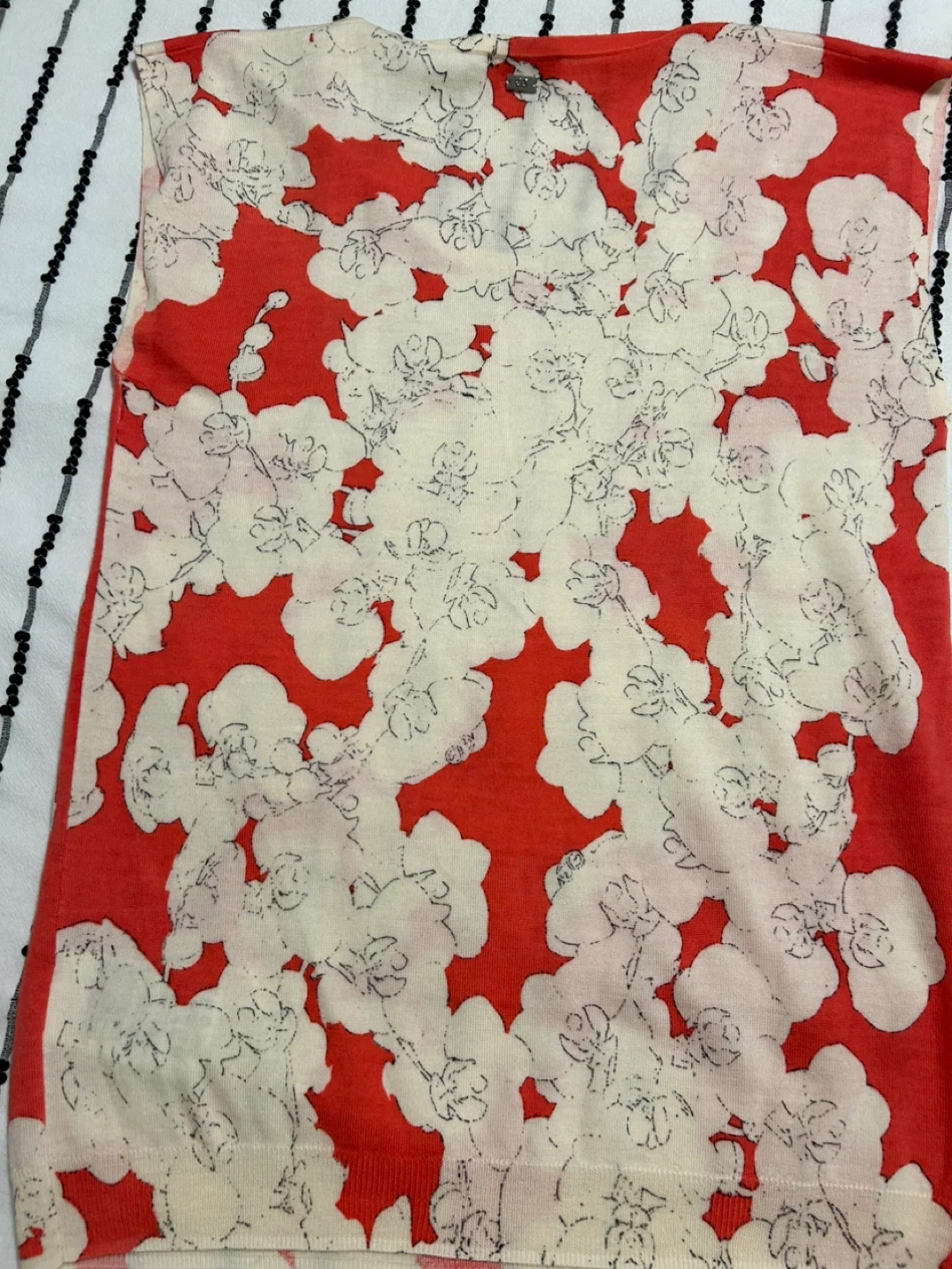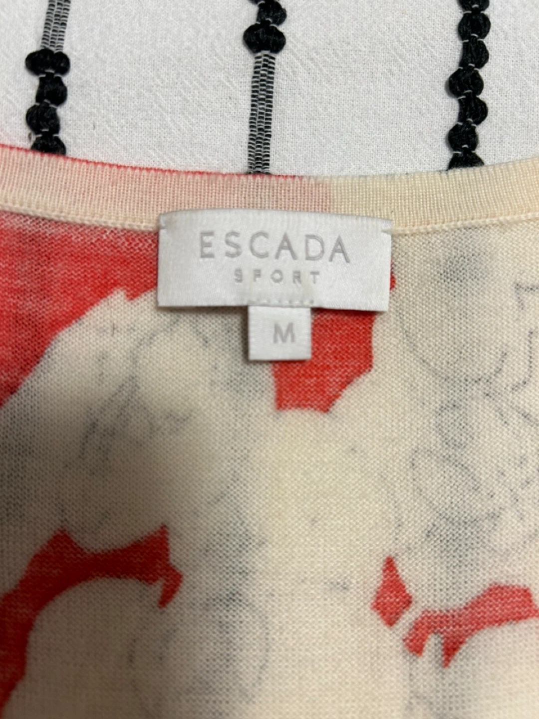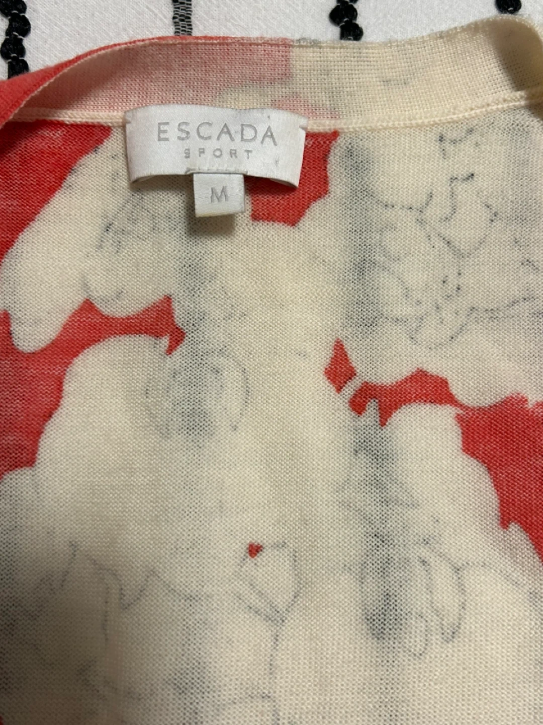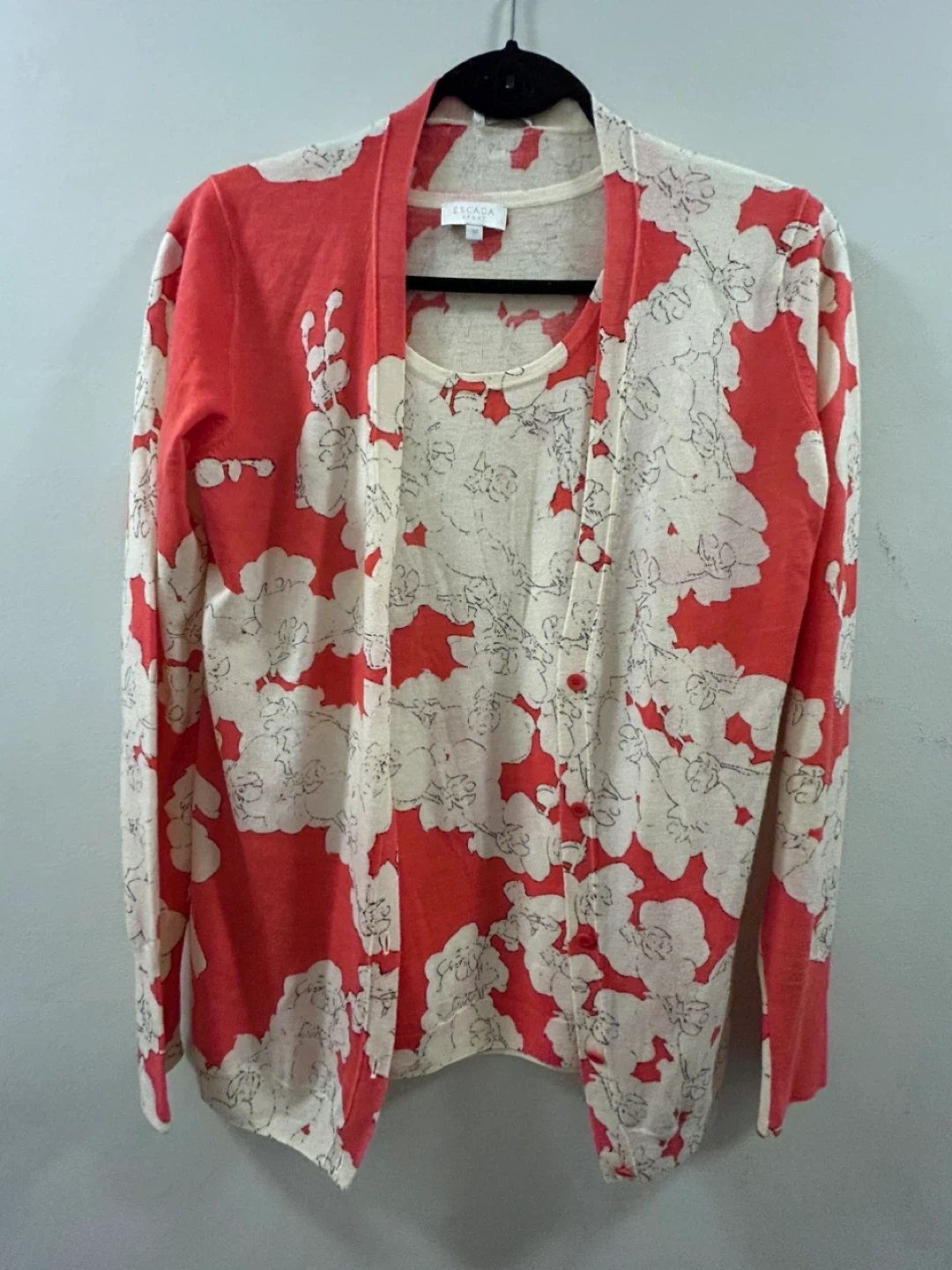 Escada Sport two-piece set featuring a coral red and cream floral print. It's a sleeveless tank top and a matching long-sleeved cardigan. Size is medium.