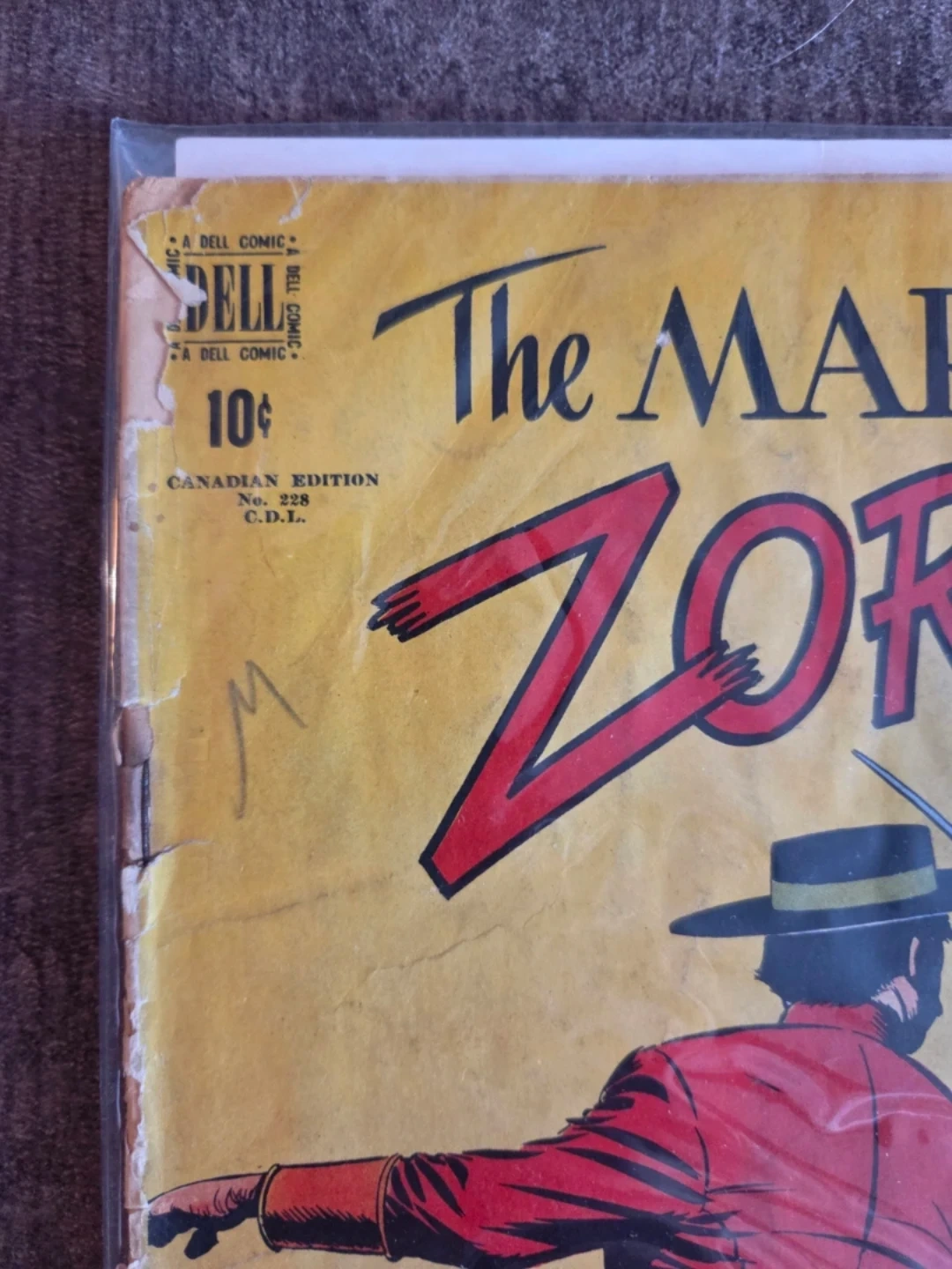 This is The Mark of Zorro comic book, issue #228. It's a Canadian Edition published by Dell Comics in 1949. The cover shows a duel between Zorro and another character. Some wear is visible on the cover's edges.