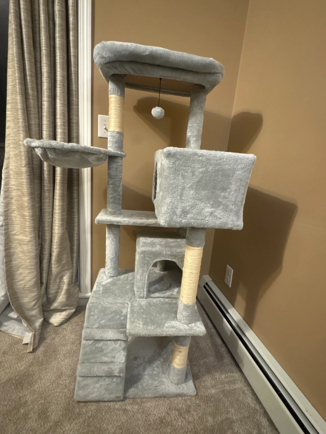 Brand new Large cat tree, grey plush fabric. Multiple levels, scratching posts, and a hanging toy. Bought on Amazon new a few weeks ago for $105. My cat has zero interest.