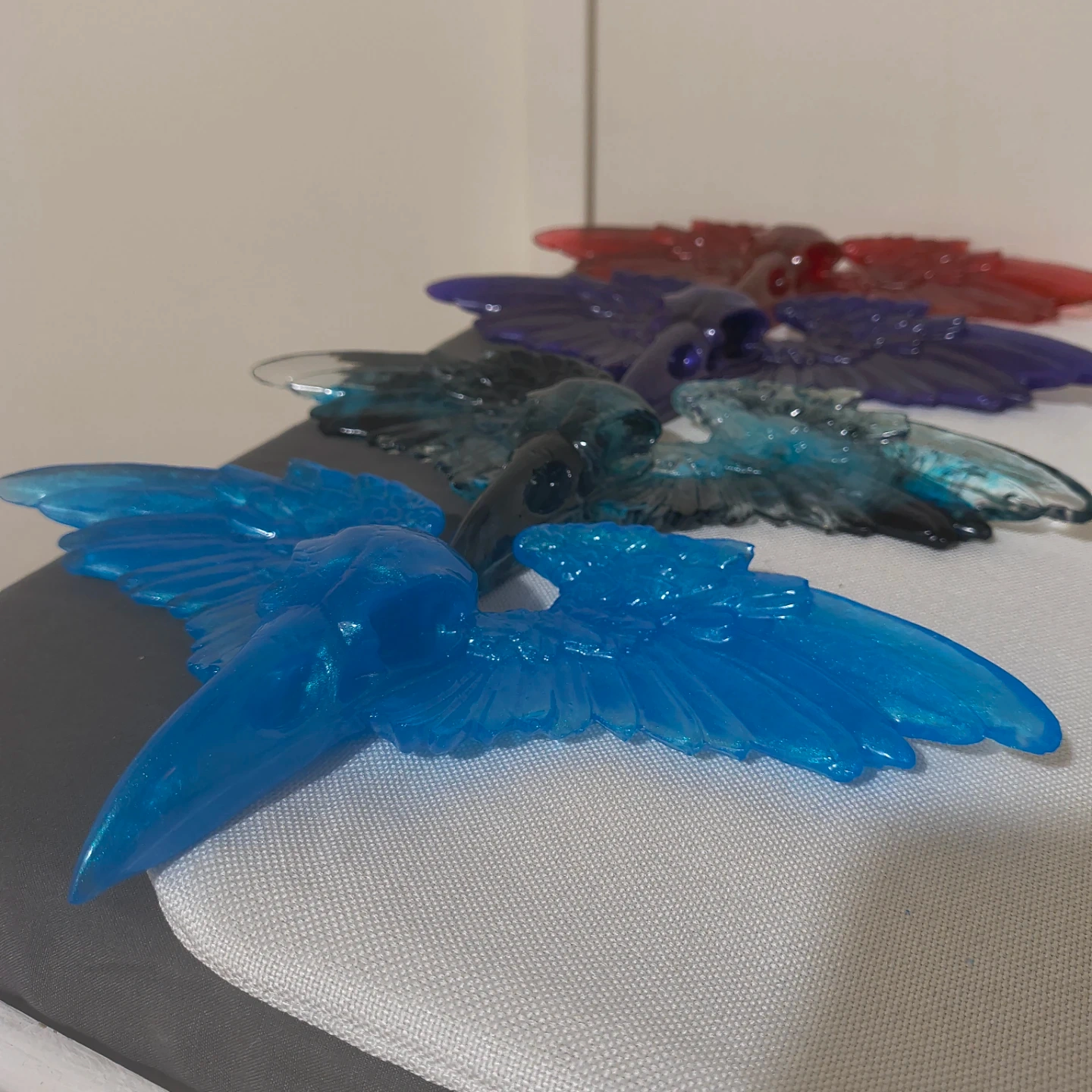Red resin figurine featuring an eagle skull with outstretched wings. It's a decorative piece with a metallic shimmer. This item could be used for Halloween decor or as part of a collection.
