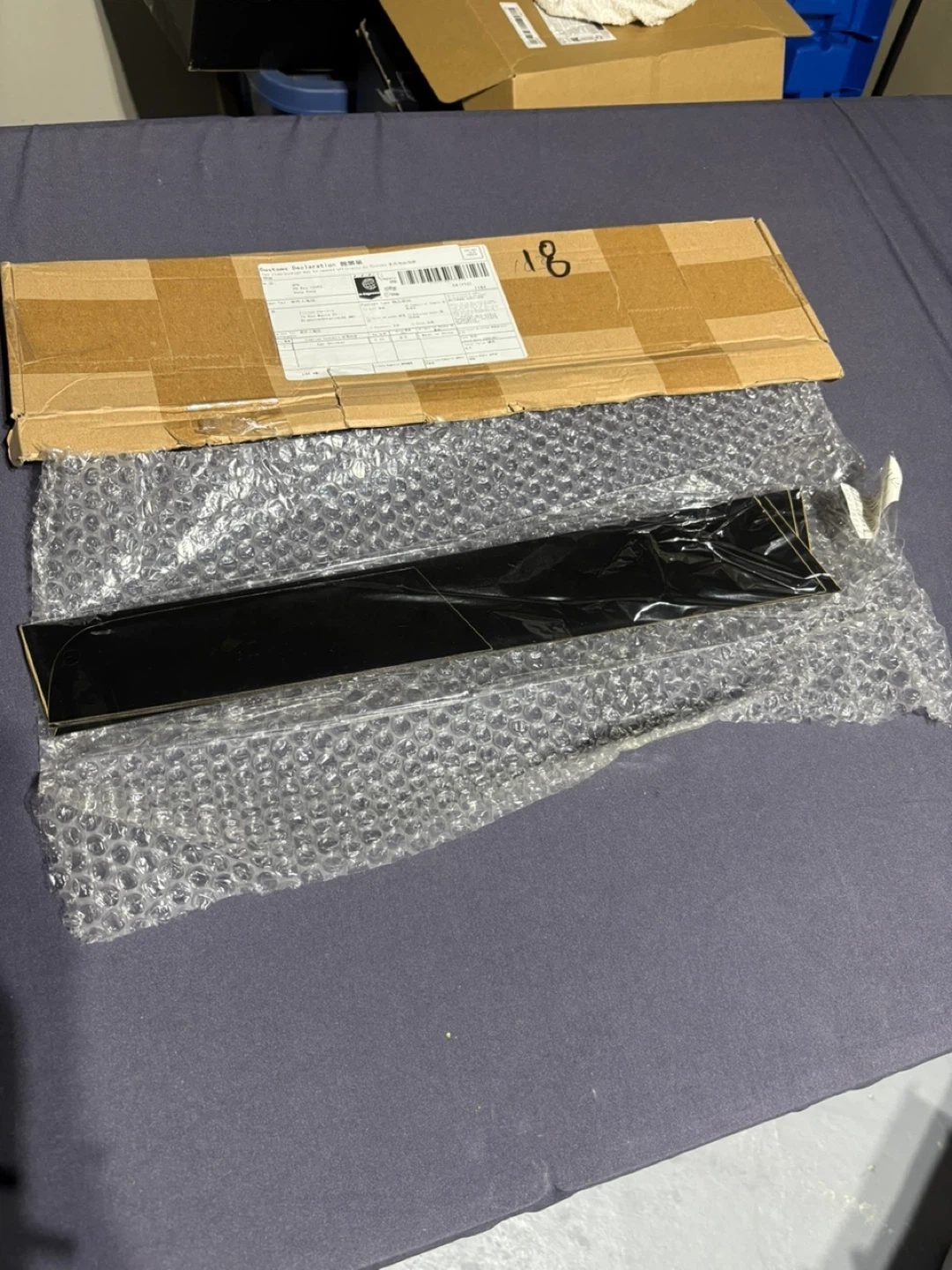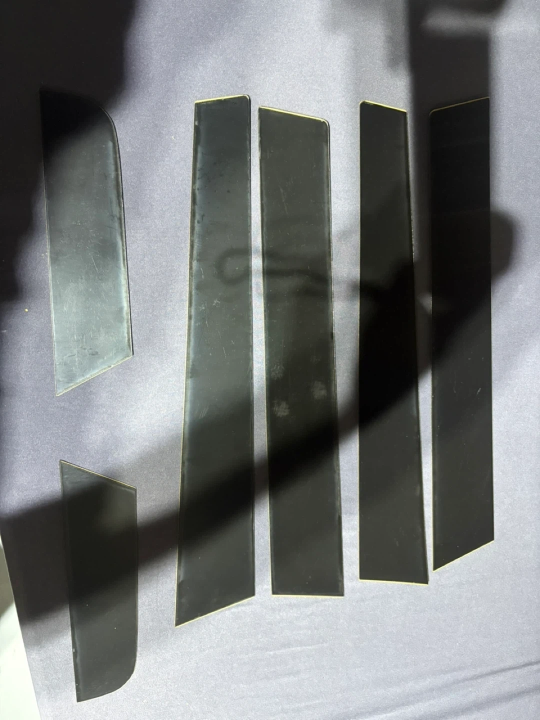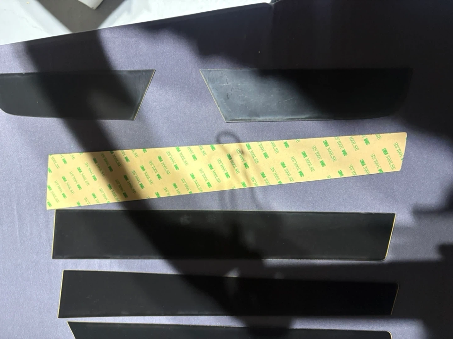 This is a window trim kit for a vehicle. It's made of black plastic and comes with 3M adhesive tape. The kit includes multiple pieces for different parts of the window frame.