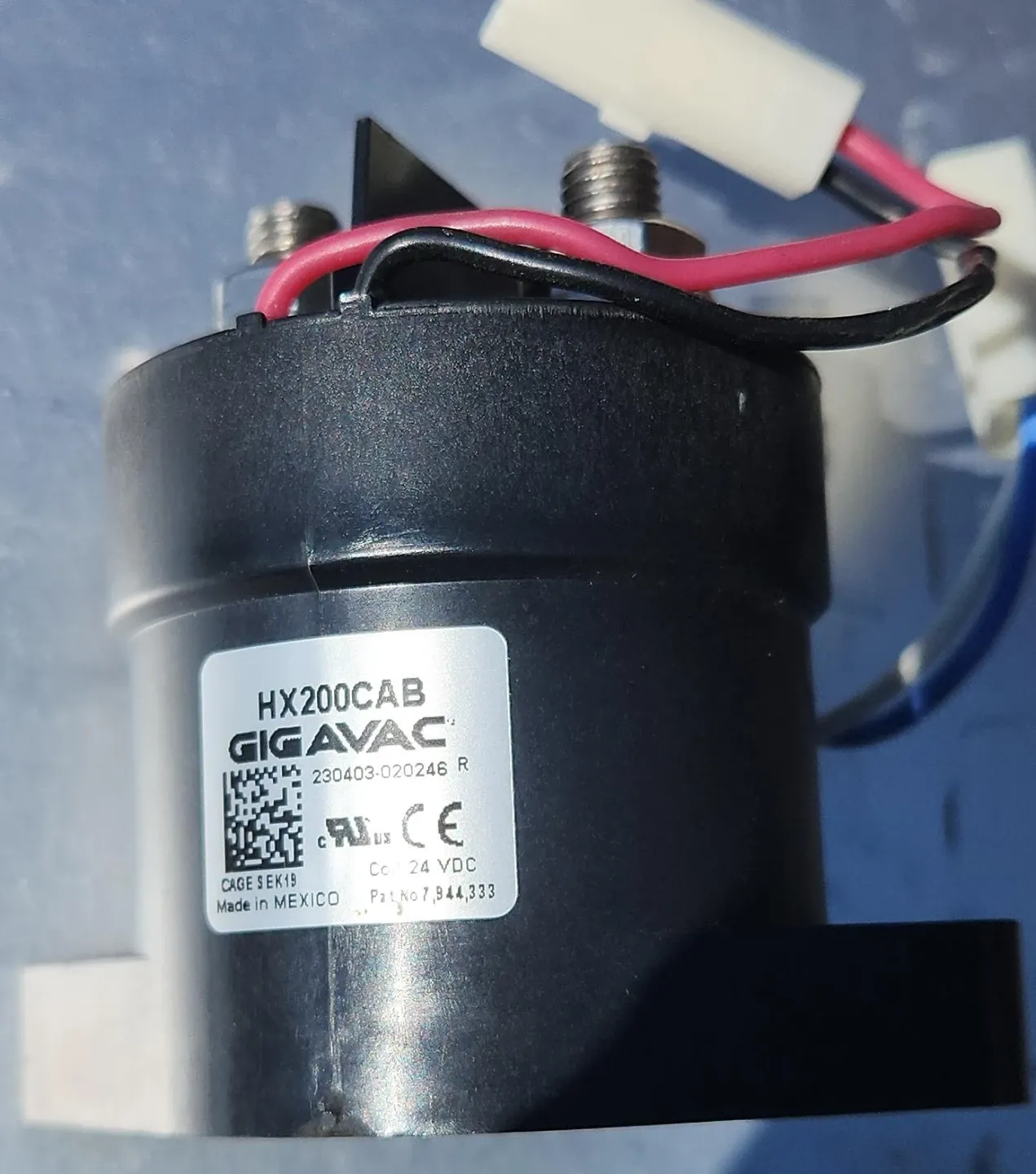 This is a Gigavac HX200CAB solenoid contactor good for 200amps AC/DC. Its coil operates at 24 VDC.