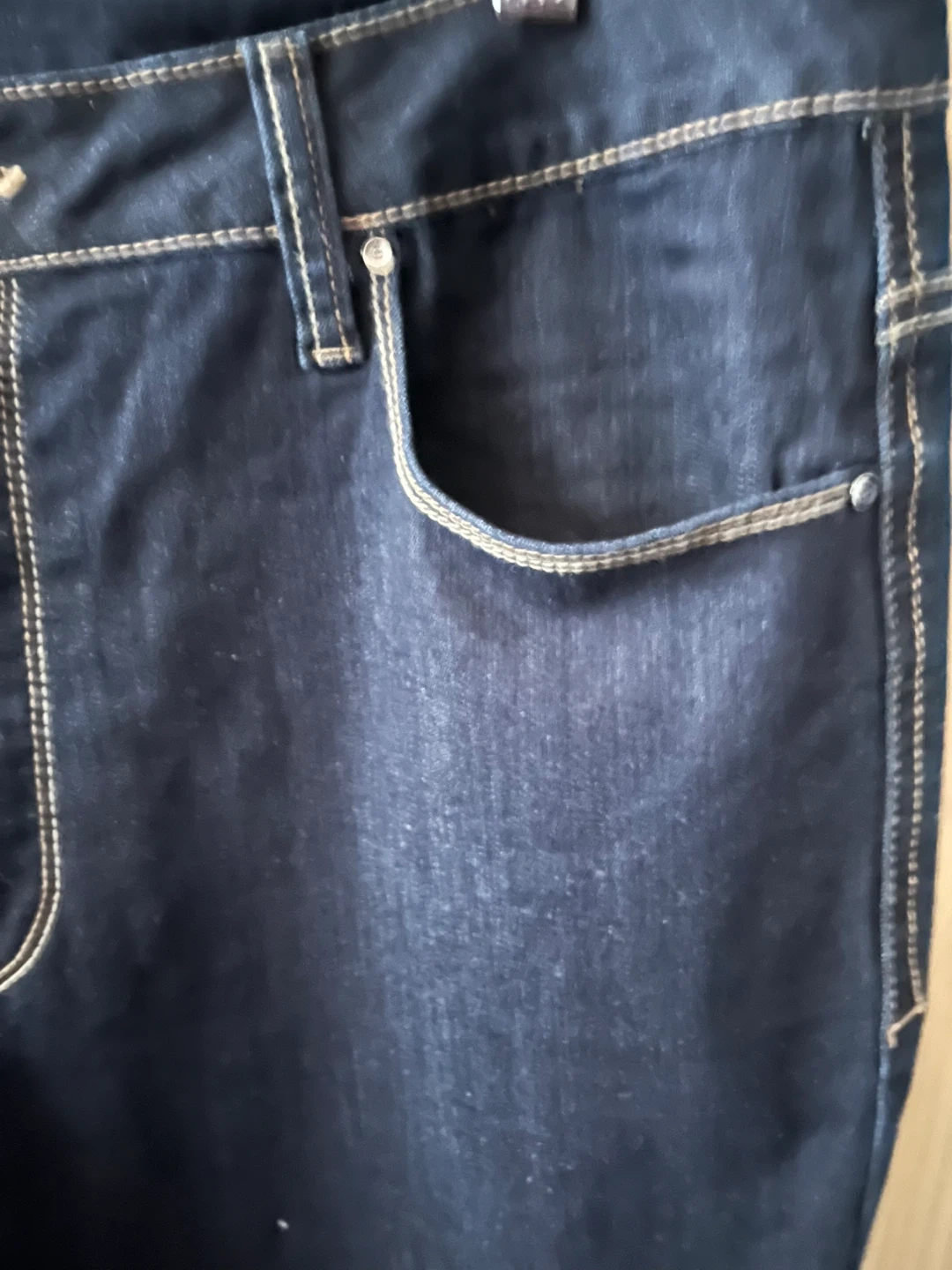 Dark wash denim jeans. They're a high-rise fit with a slim leg cut. Comfortable for everyday wear. Made with a cotton blend.