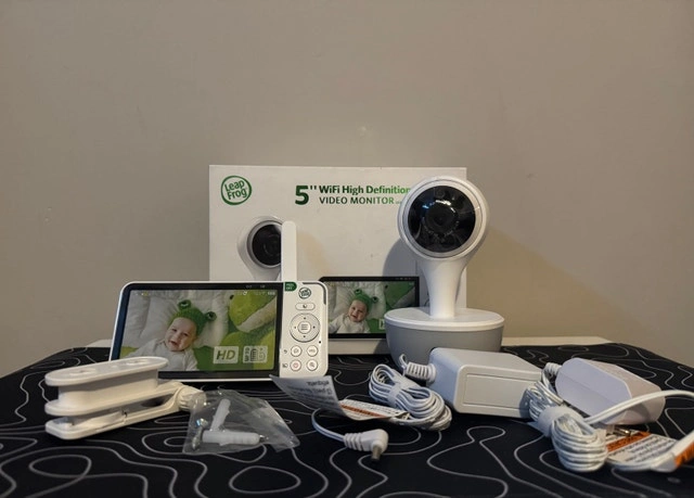 Monitor your baby from anywhere with this WiFi baby monitor featuring a 5" HD color LCD screen and full-color night vision. View and listen live on multiple devices through the LeapFrog Baby Care app with no fees or subscriptions. Features: 5" HD color display, WiFi connectivity for remote viewing, Color night vision for low-light clarity, Sound & light profile from WeeSleep™, Temperature & humidity sensor, Professional in-app sleep advice and videos, Free live access via smartphone or tablet. All cables and accessories included. Open box new, fully tested and working perfectly. You can test it in person before purchase. Pickup near Rossland Rd & Brock Rd, Ajax. Cash only.