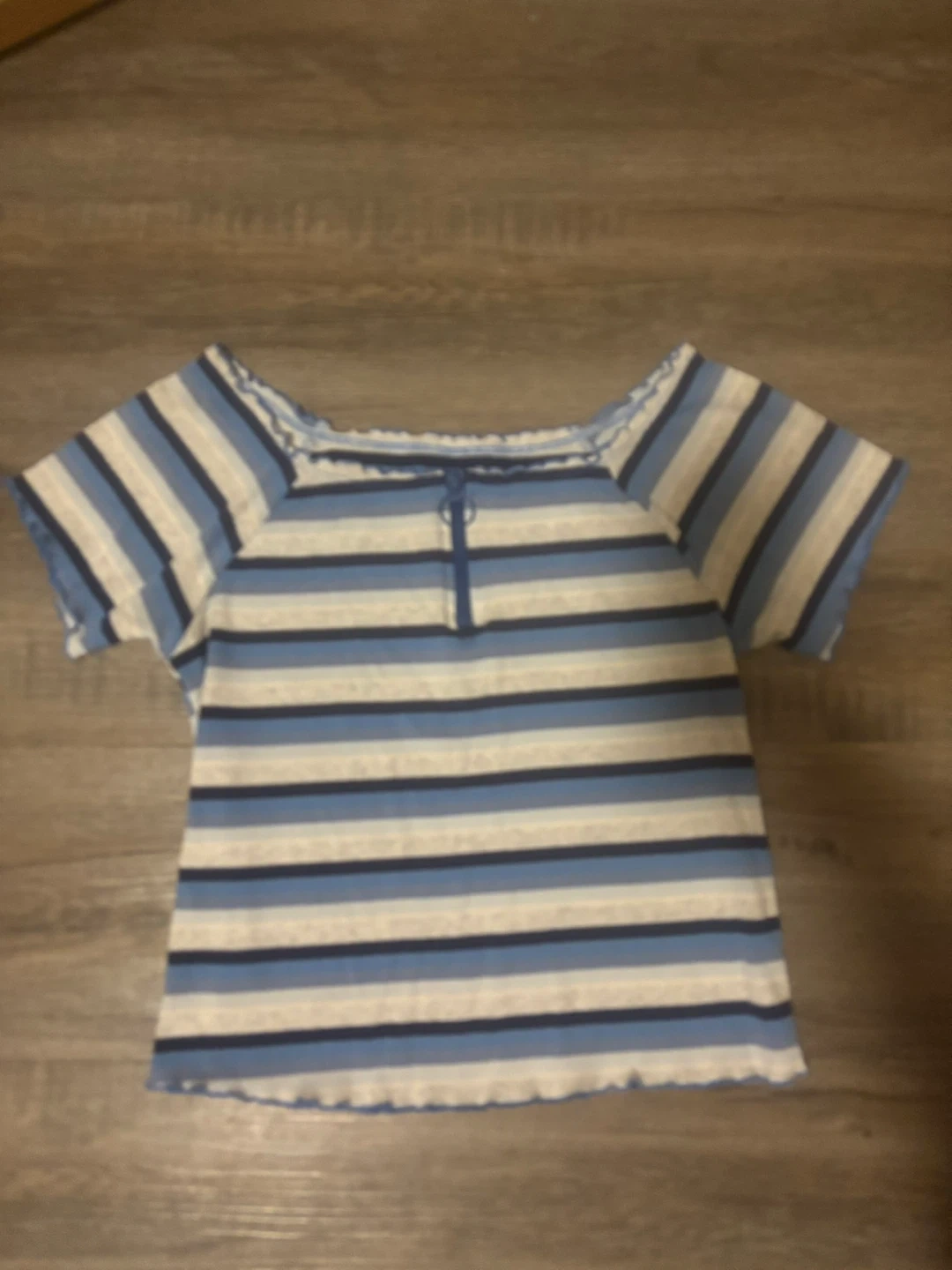 This is a blue and white striped short-sleeve top. It features a scoop neckline with a small zipper detail and lettuce trim on the sleeves and hem. Fits size small women’s.