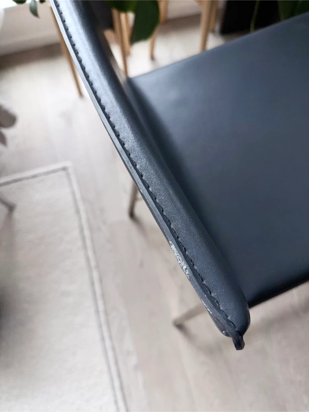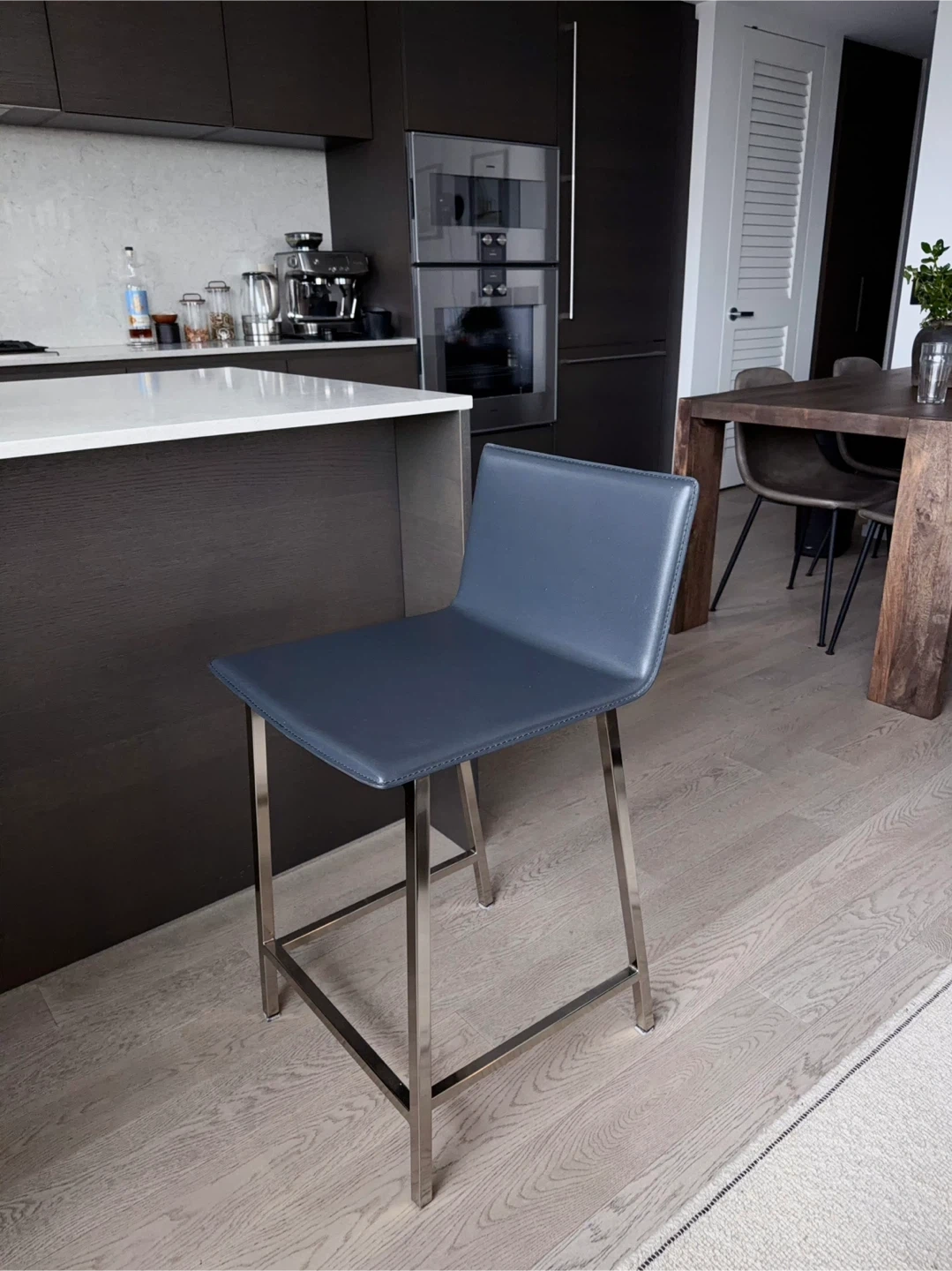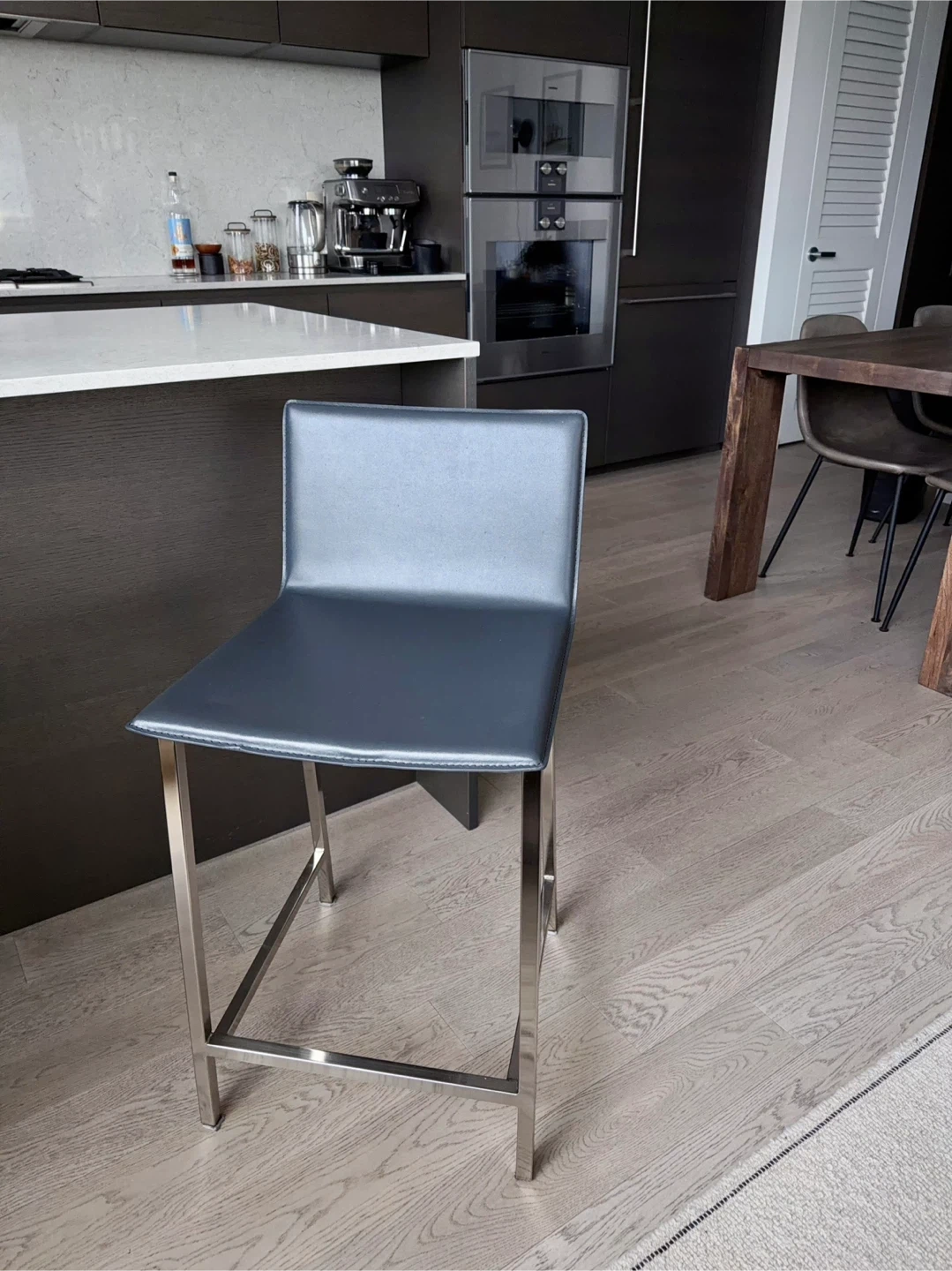 Sleek, modern grey leather bar stool with a chrome frame. Seat is 16" wide and 16" deep. Total height is 33.5" with a seat height of 24.5".