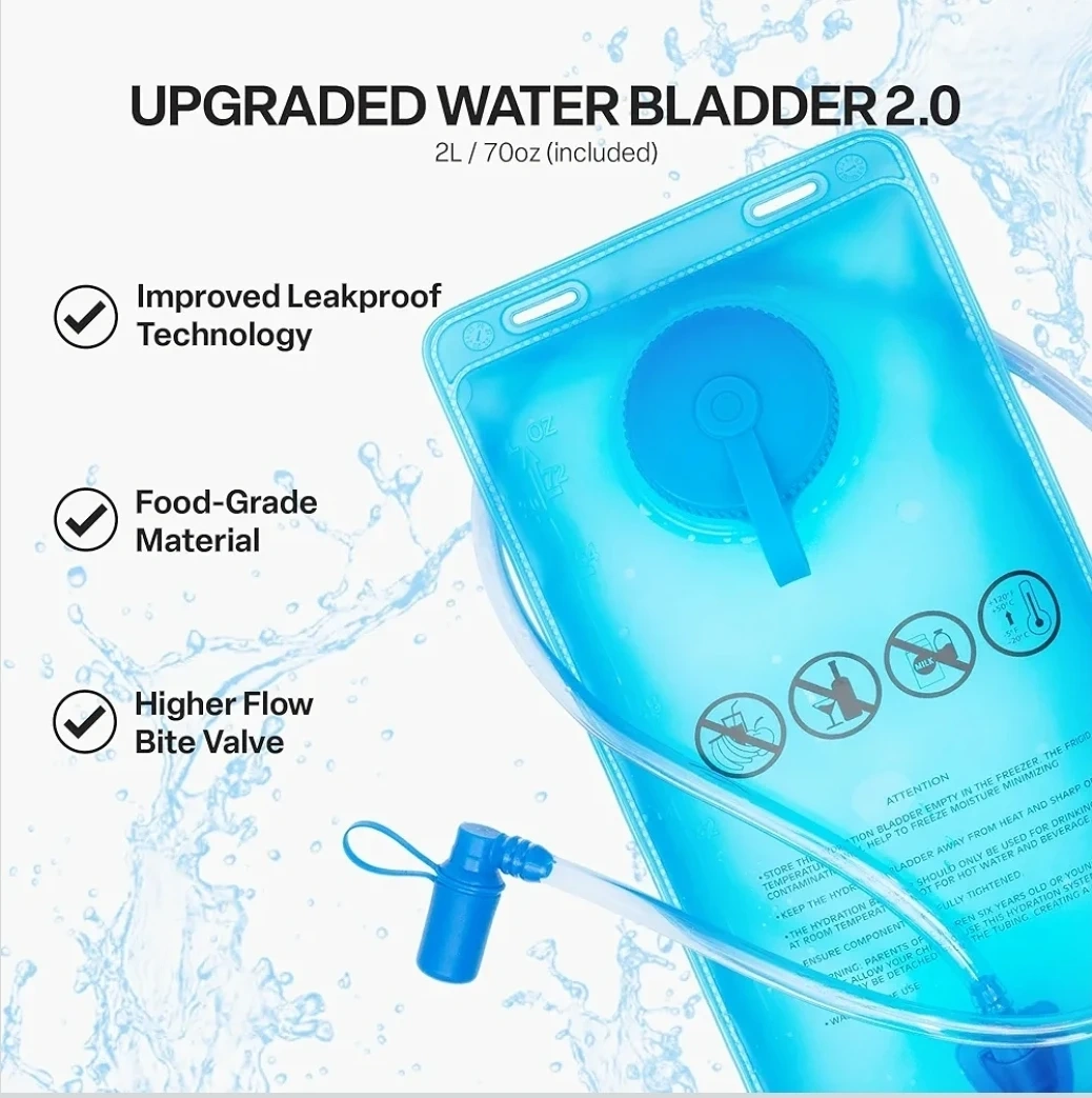 • Includes upgraded 2L / 67 oz food-grade PEVA hydration bladder