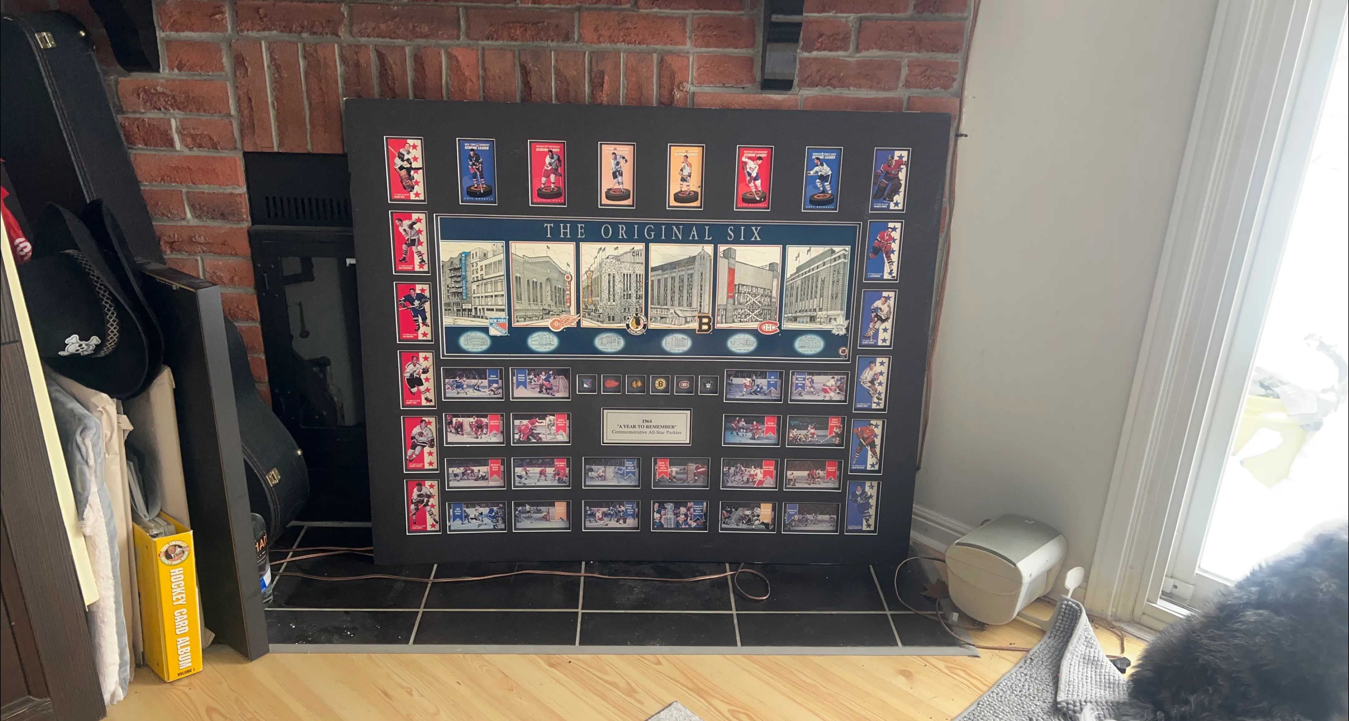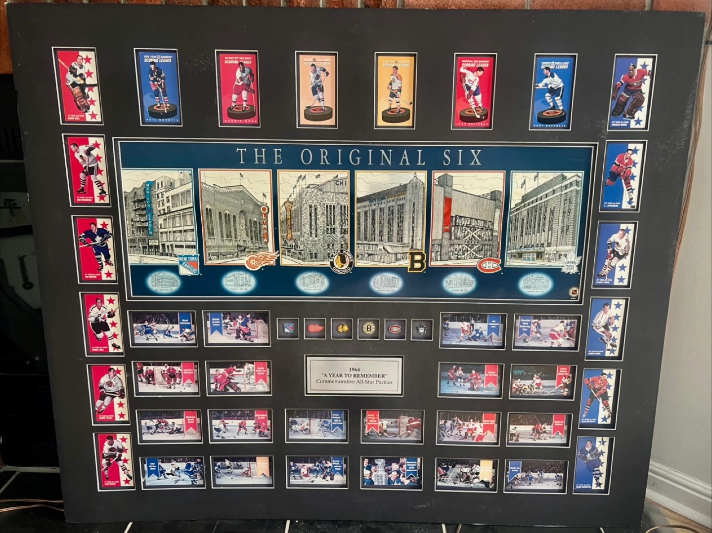 This display celebrates "The Original Six" hockey teams. It features "A Year to Remember" from 1964 with commemorative All-Star Parkies. A great piece for any hockey fan! Has the six Hockey arenas cards and actually collector pins of each arena !! Beautiful vintage collectors item