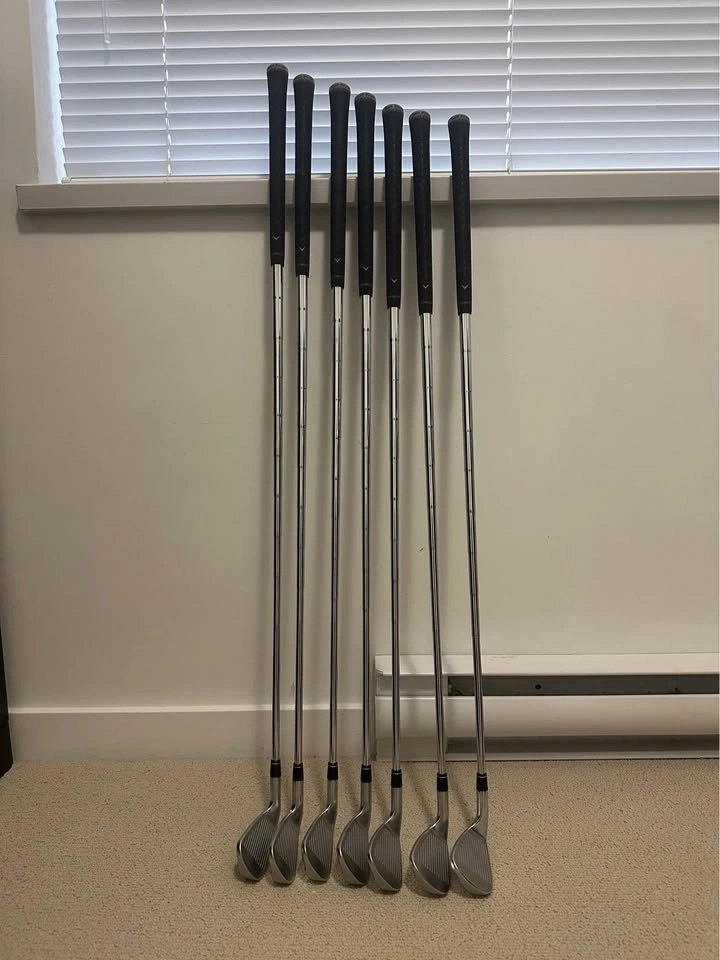 Excellent condition used, only played 2 rounds (18 holes each). Features True Temper Dynamic Gold Mid Steel shafts with R flex, and Golf Pride Z grips with grey caps. Set includes 5-9 irons, Pitching Wedge (Pw), and Approach Wedge (Aw). Originally purchased for $1890 from the Callaway official website. These are a great choice if you're looking for irons that provide excellent distance for mid-to-low handicappers.