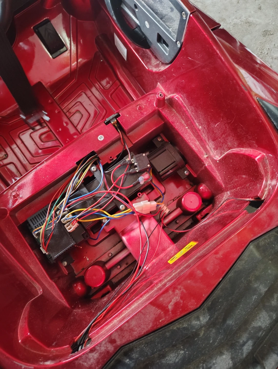 This is a shiny red ride-on sports car, perfect for young drivers. It features a realistic steering wheel and interior controls. Its durable plastic construction is built for fun and adventure! Currently not working new battery required