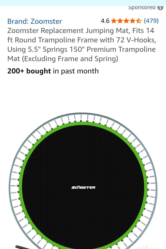 Selling a Zoomster replacement jumping mat for a 14 ft round trampoline frame. It fits frames with 72 V-hooks and uses 5.5" springs. This is a 150" premium trampoline mat, excluding the frame and springs.