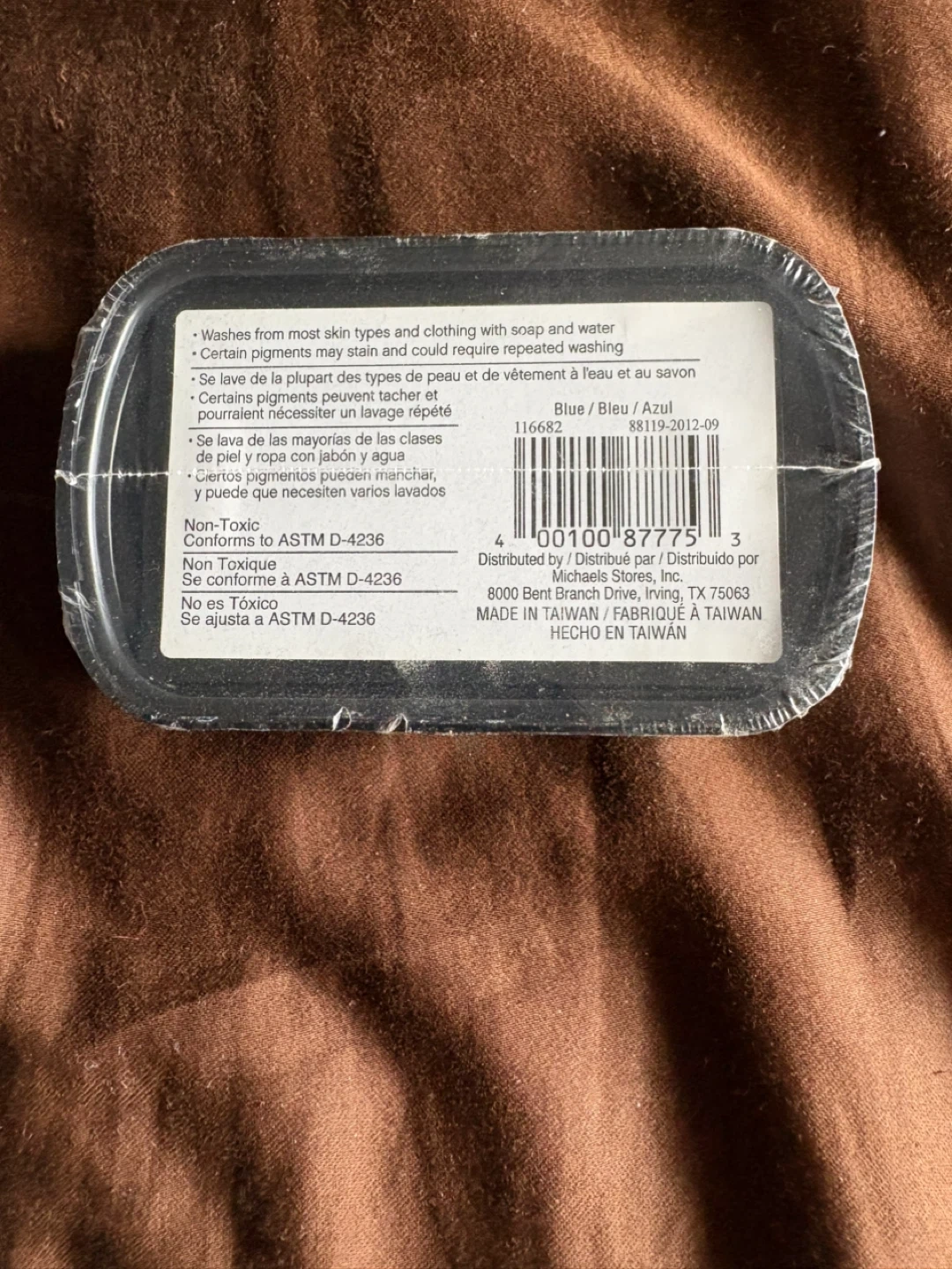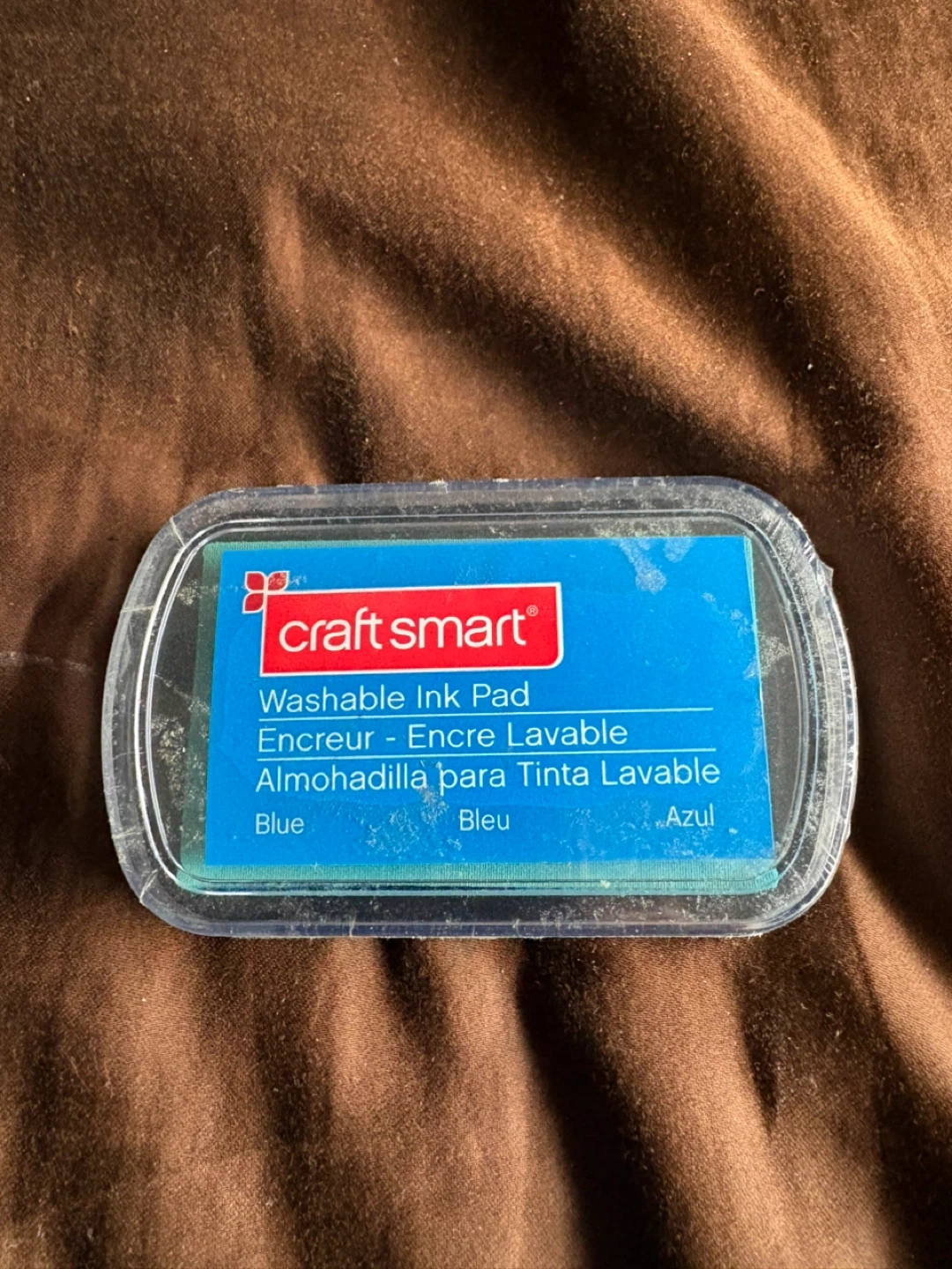 This is a blue Craft Smart washable ink pad. It's designed to wash from most skin types and clothing with soap and water. Certain pigments may stain and require repeated washing.
