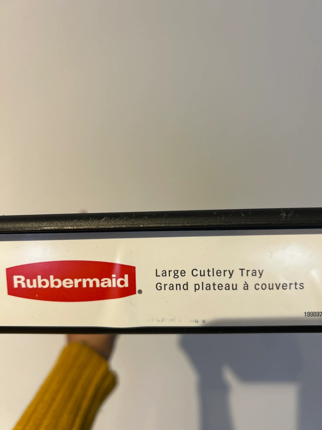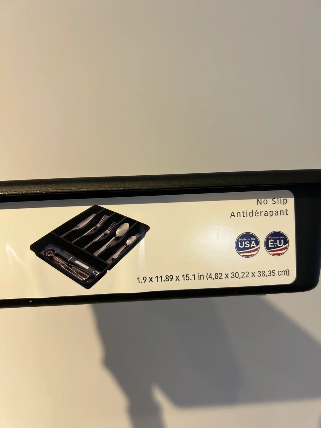 This is a Rubbermaid Large Cutlery Tray. It's black with grey inserts. The tray features a no-slip design. It measures 1.9 x 11.89 x 15.1 inches.