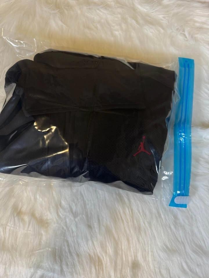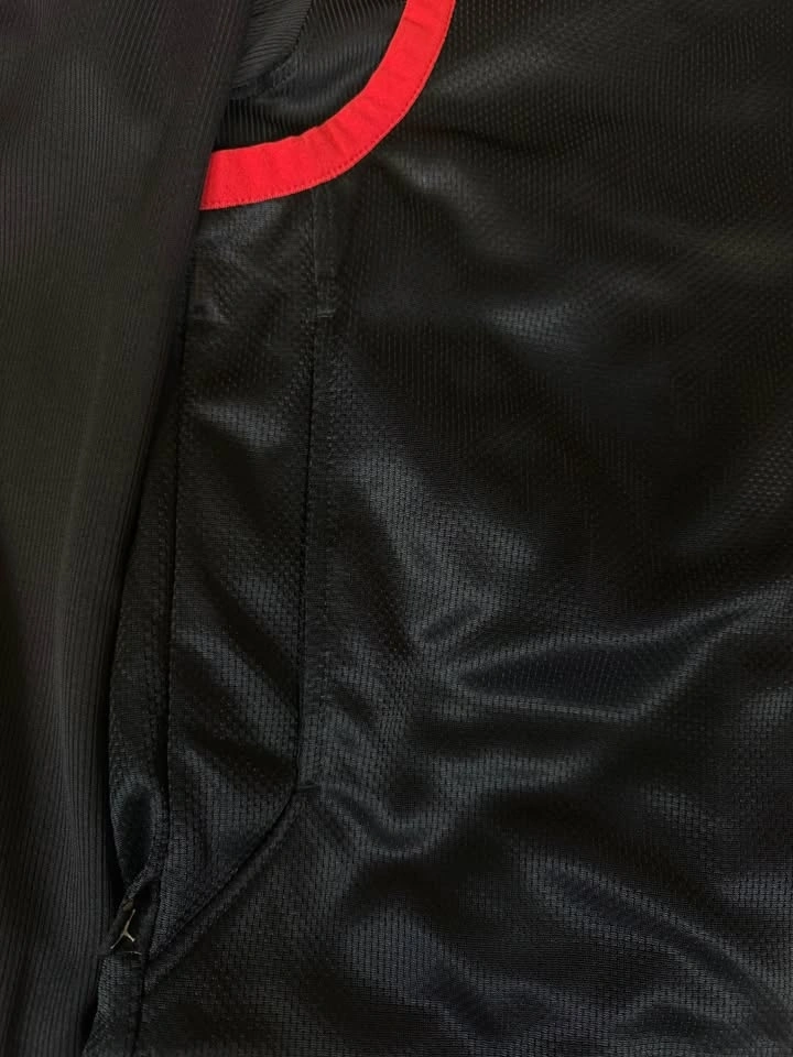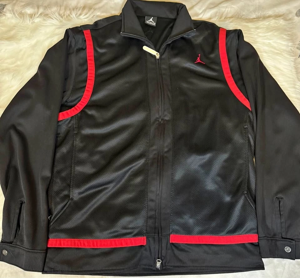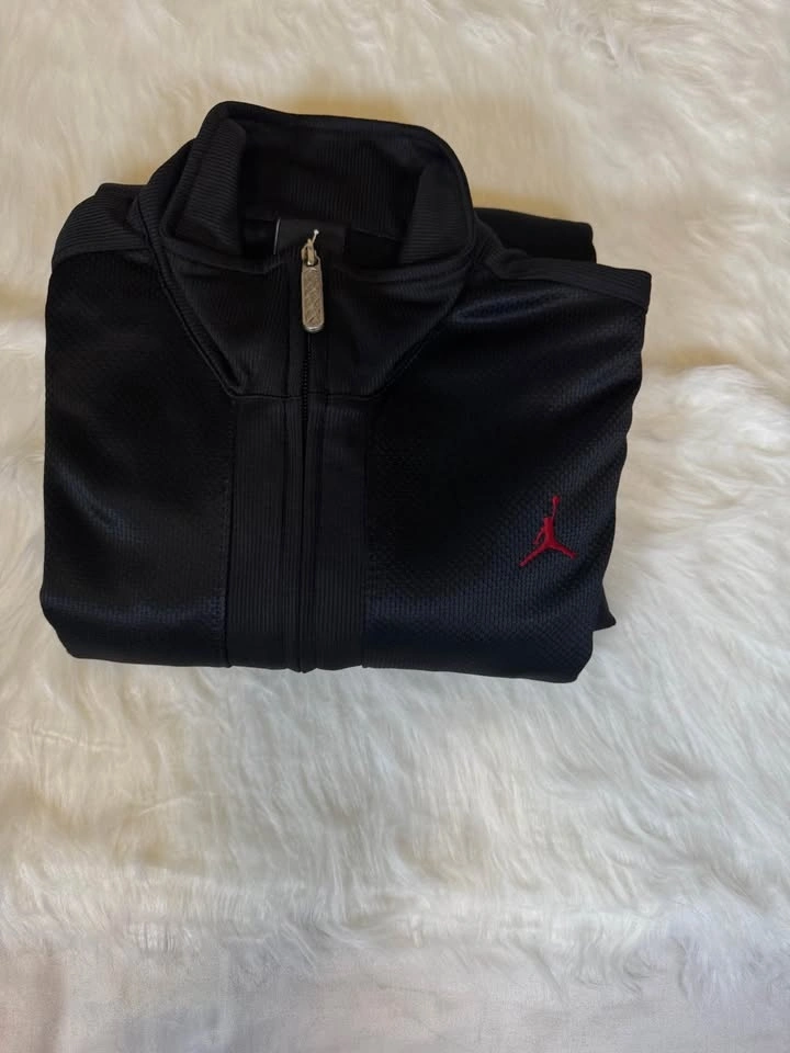 Clean black Jordan full-zip track jacket with red stripes and the iconic Jumpman logo. Comfy material, great for everyday wear or working out.