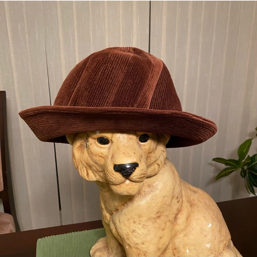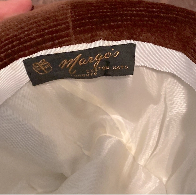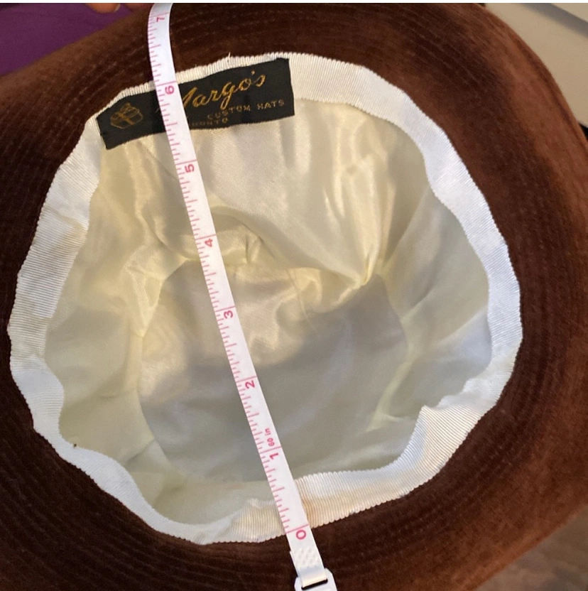 This beautiful hat features a knot style tie around the rim of the hat, which can be seen in the photos. It had a cream lining and is made out of a brown corduroy / felt fabric.