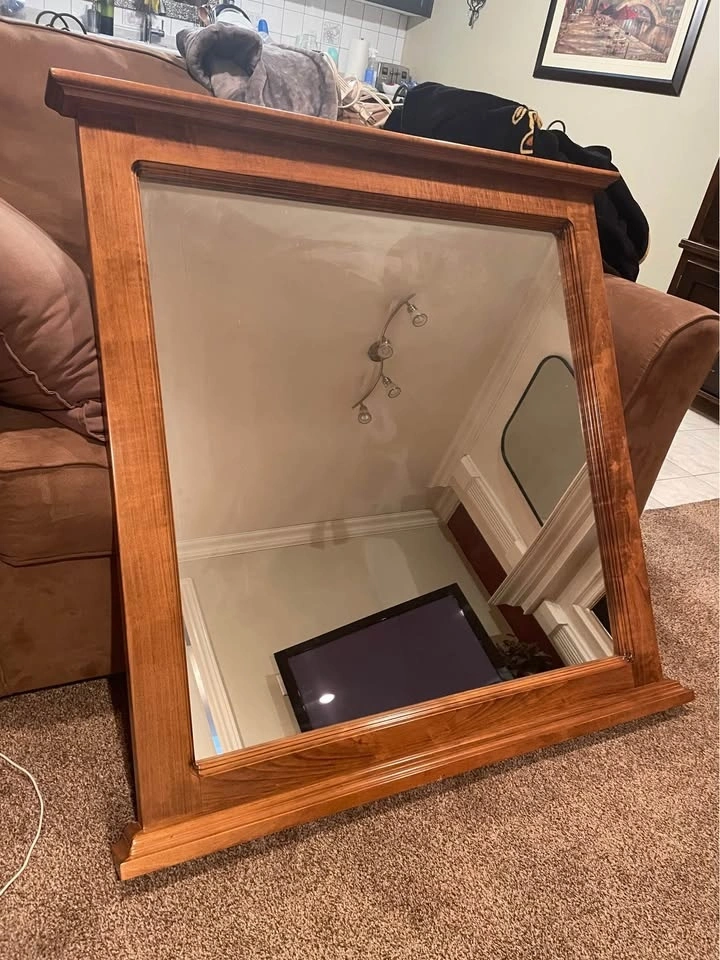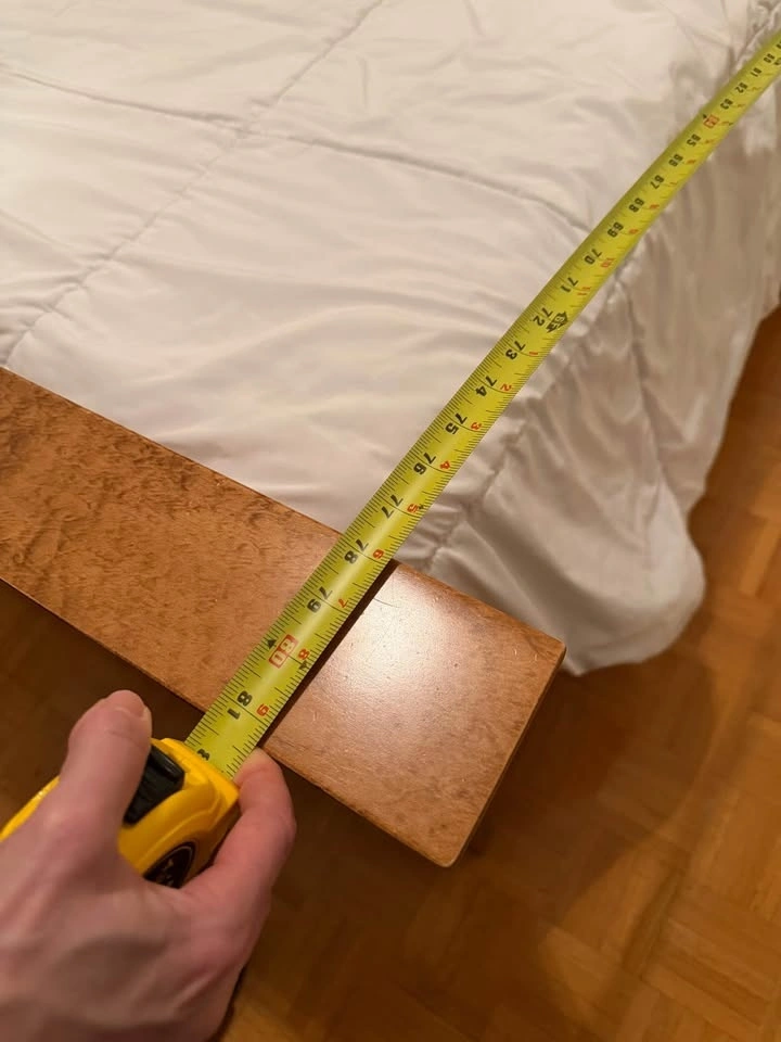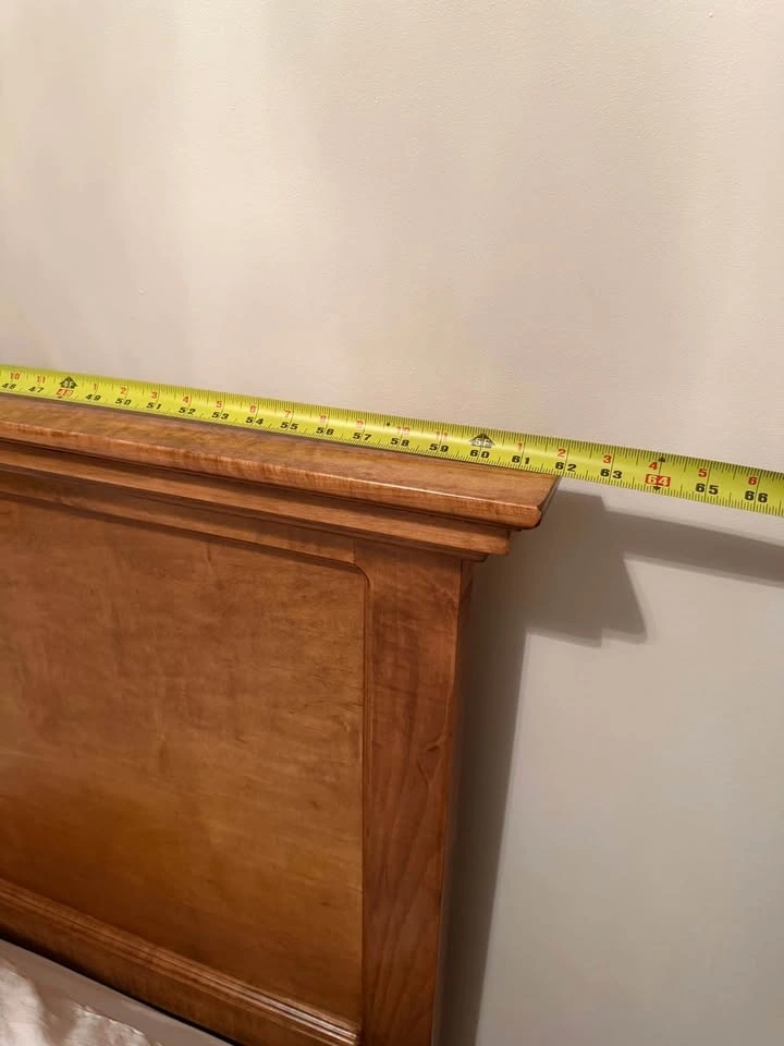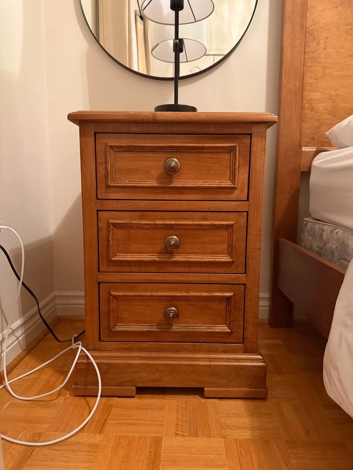 Solid wood oak bed frame and nightstand in brown tone stain finish. Bed frame is 8 inches tall. Nightstand is 27 inches tall with 3 drawers. In great condition.