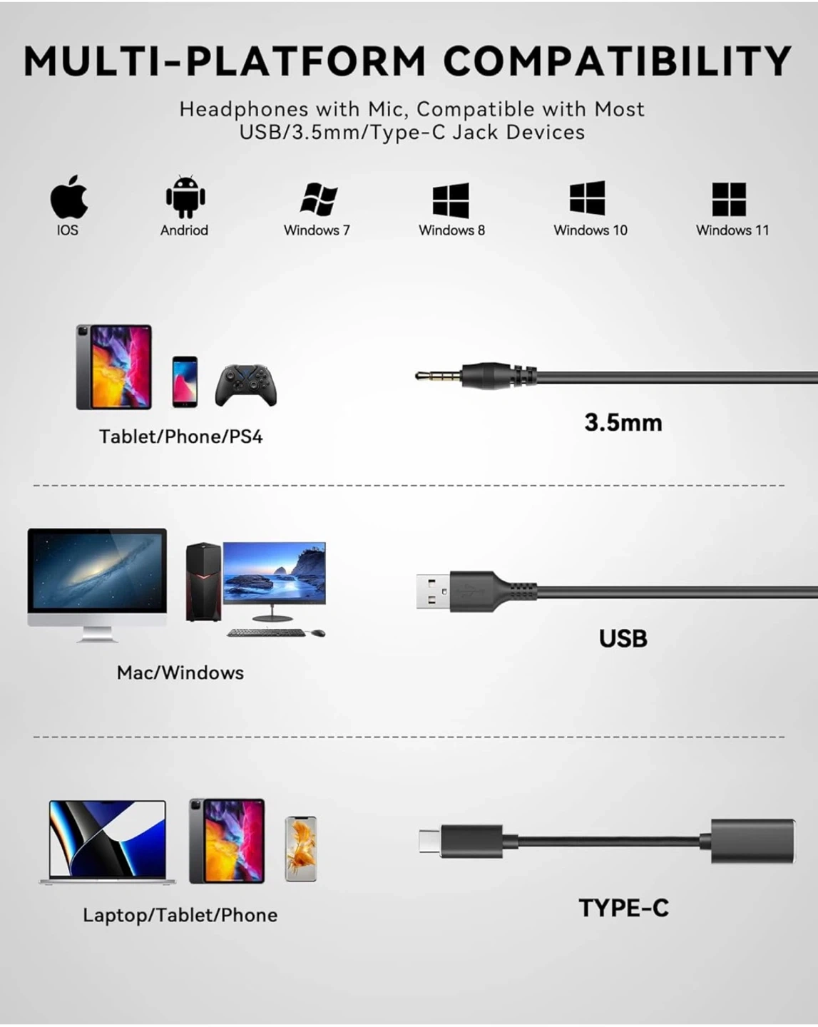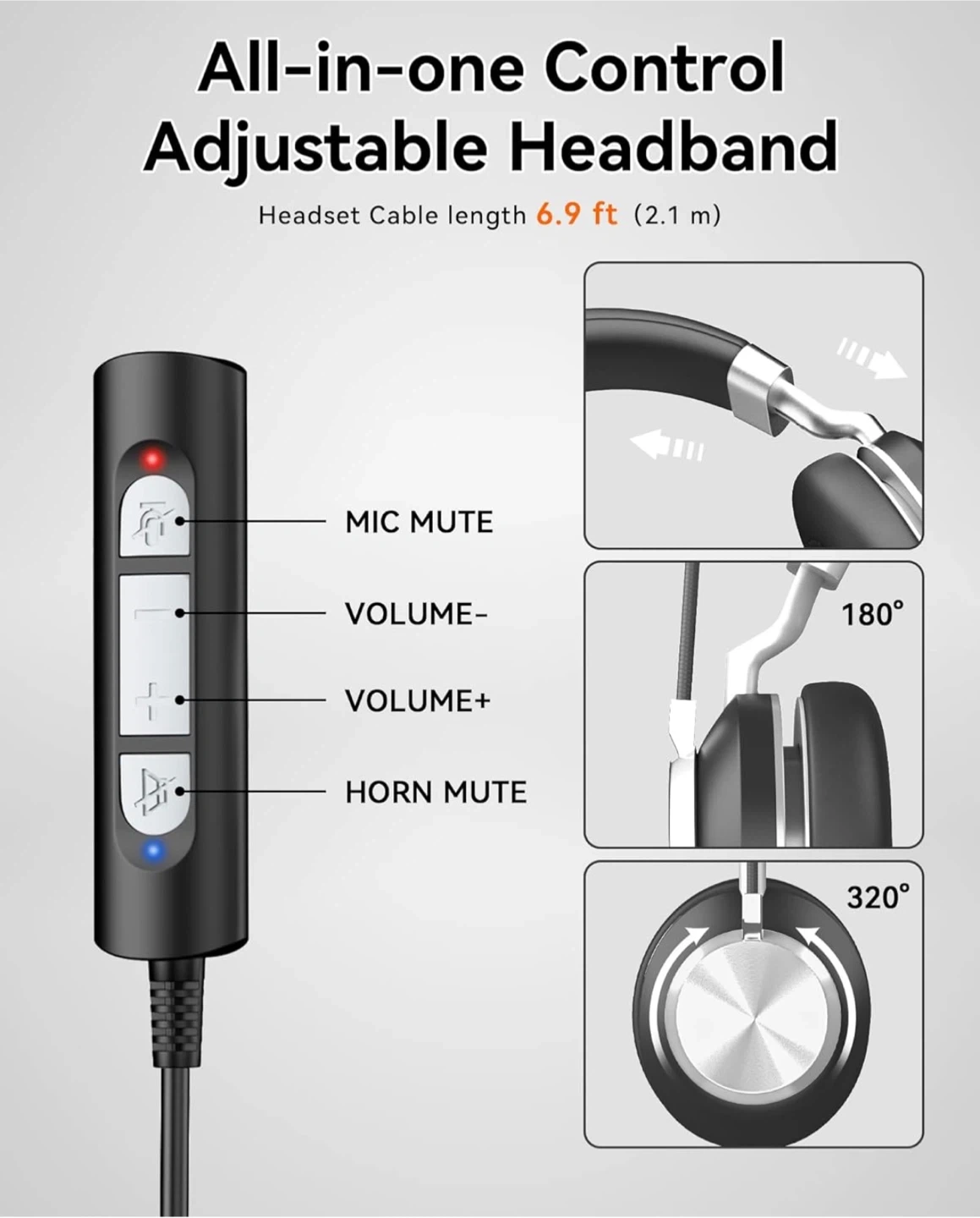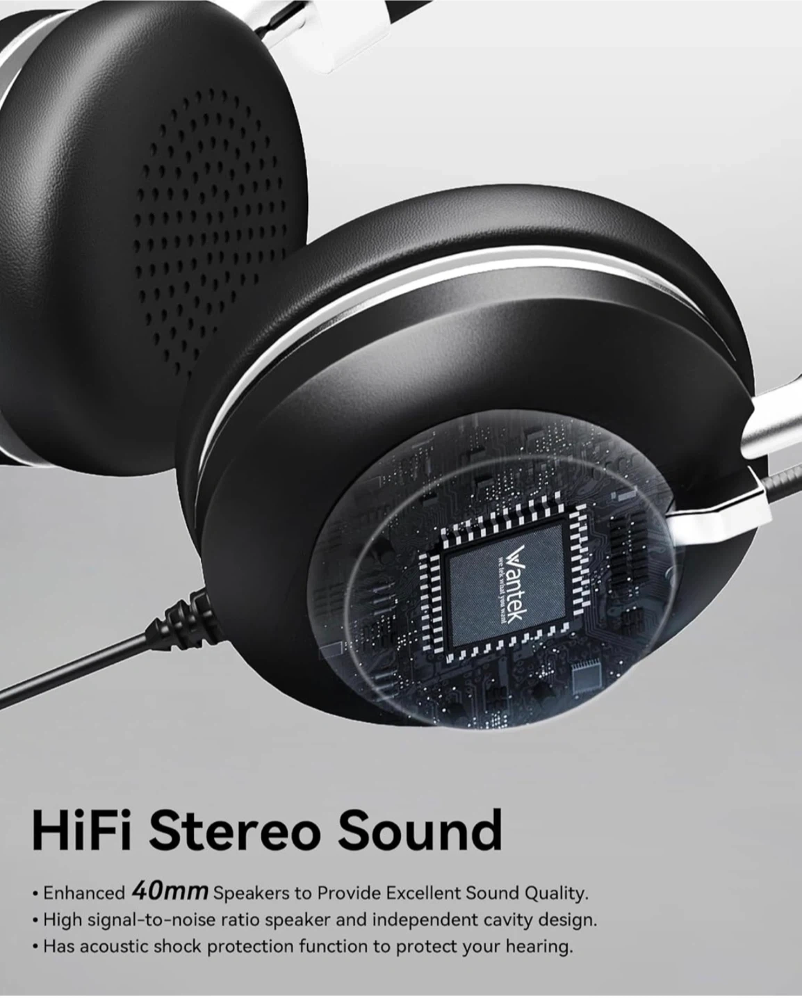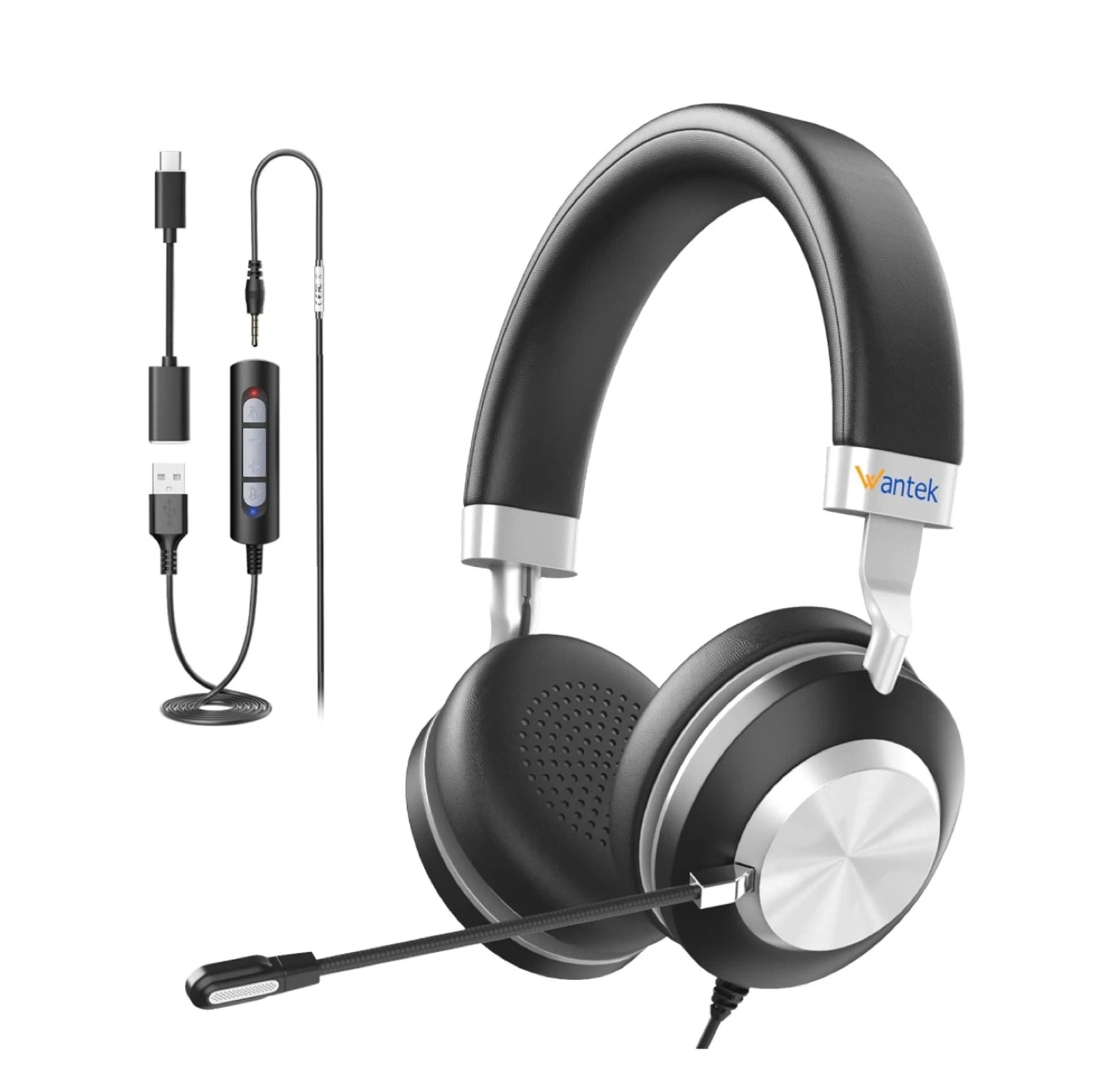 Wantek computer headset with a noise-cancelling microphone. It features soft leather head cushion and adjustable ear pads. The cable length is 6.9 ft.