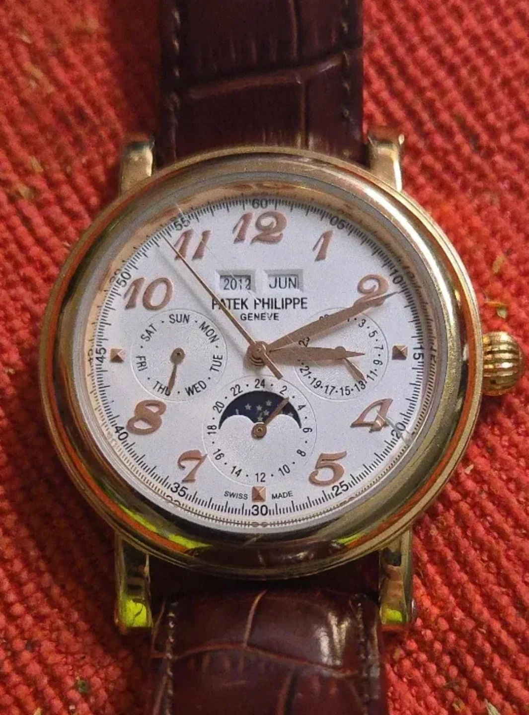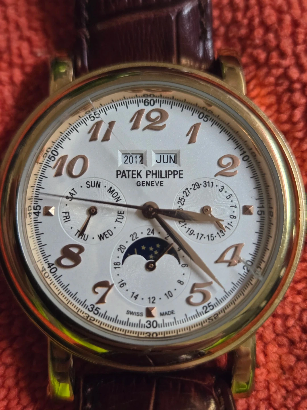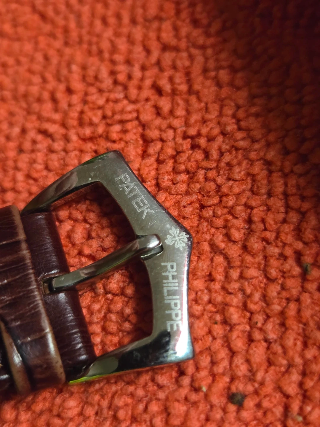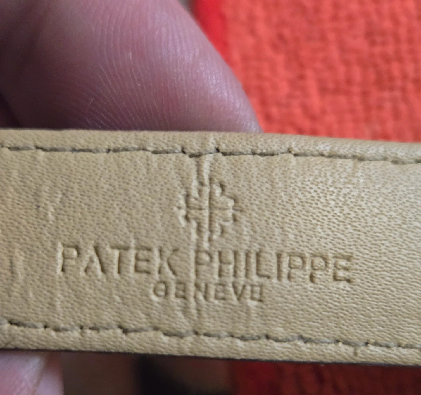 Selling a Patek Philippe watch with a brown leather strap. The strap is made of genuine leather. The watch has a gold / white gold case and buckle. The back of the watch has the number NO.5059 on it aswell as 18k