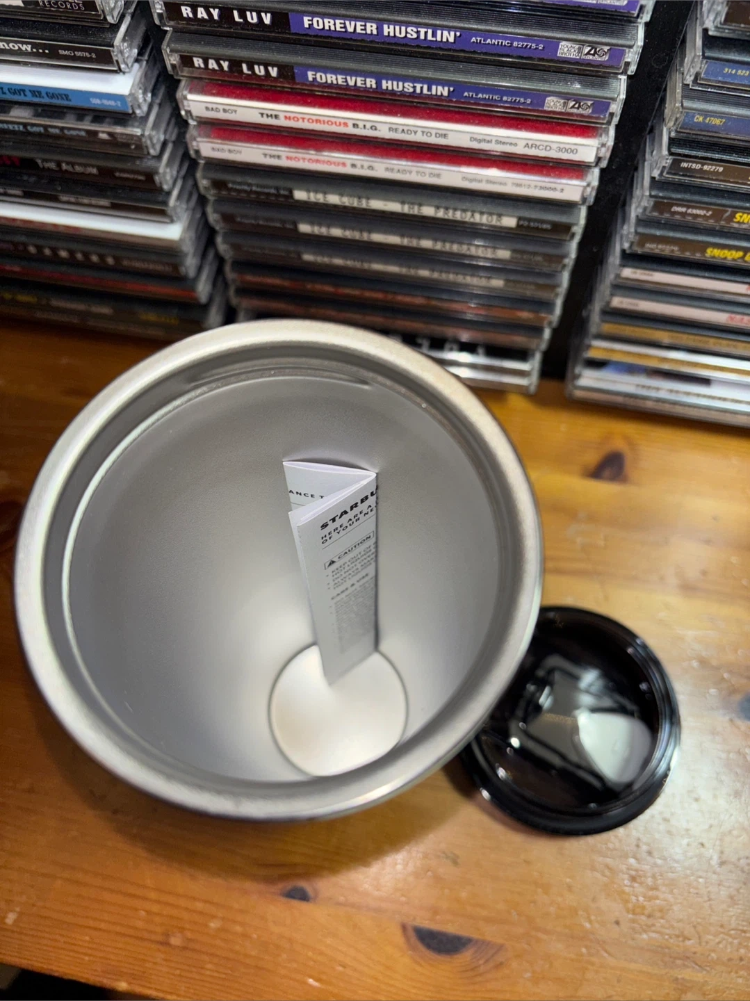 This is a black Starbucks travel tumbler with a white grip band. It holds 16 oz or 473 mL. It's made in China. Comes with a black lid.