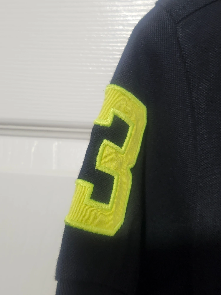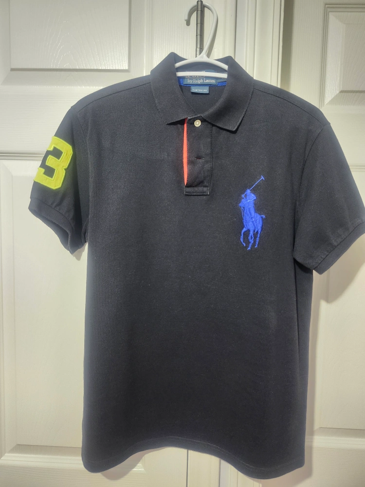 Selling a Polo by Ralph Lauren polo shirt in black. It's a custom fit and size small. The shirt features a large blue polo player logo and a yellow number '3' on the sleeve. Great for a casual look!