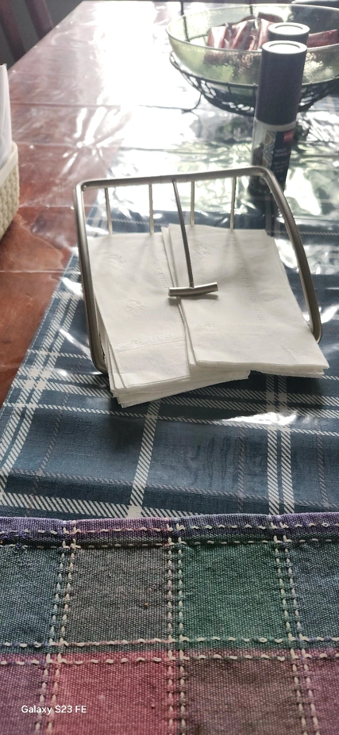 This is a metal napkin holder. It's great for keeping napkins tidy on your table or counter. Its simple design fits most decor styles. Price firm only cash only pickup no delivery 801 O'Connor drive outside TD Canada Trust bank door East York