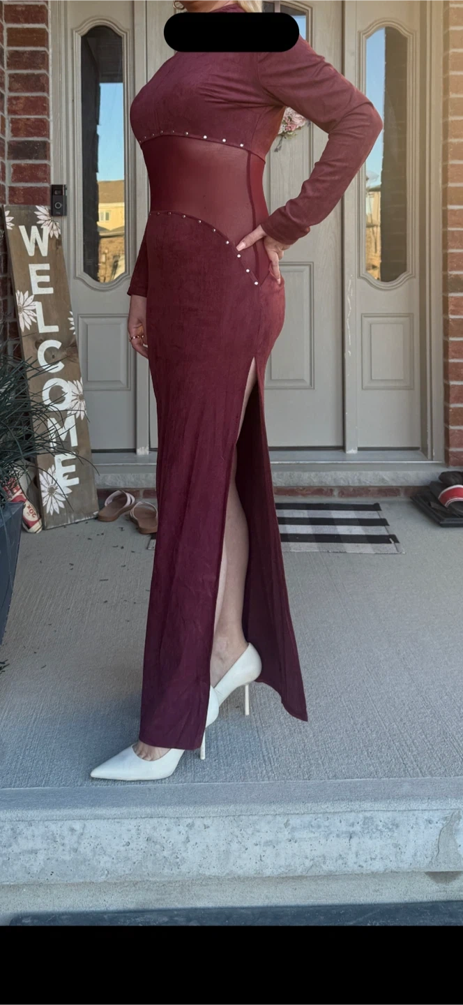 This burgundy maxi dress features long sleeves and a flattering bodycon fit. It has a high neckline and a stylish slit up the side. Sheer mesh panels with decorative studs add a touch of flair.