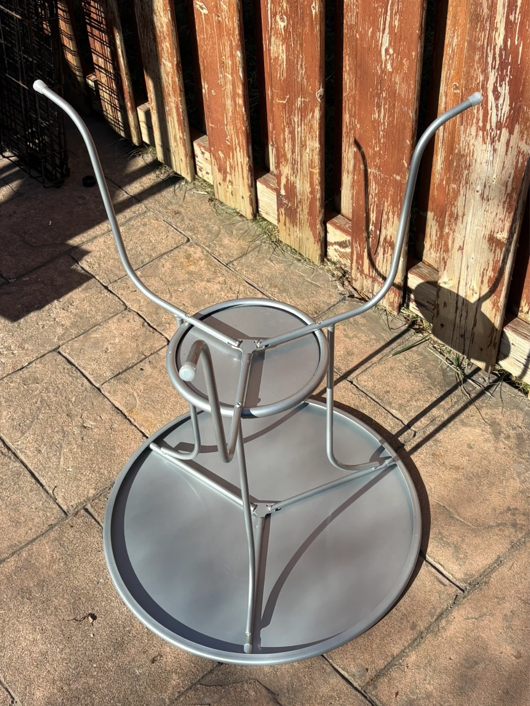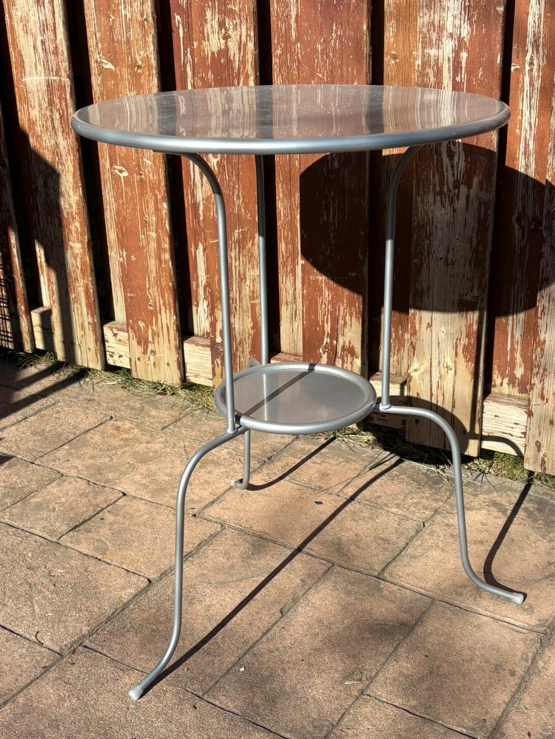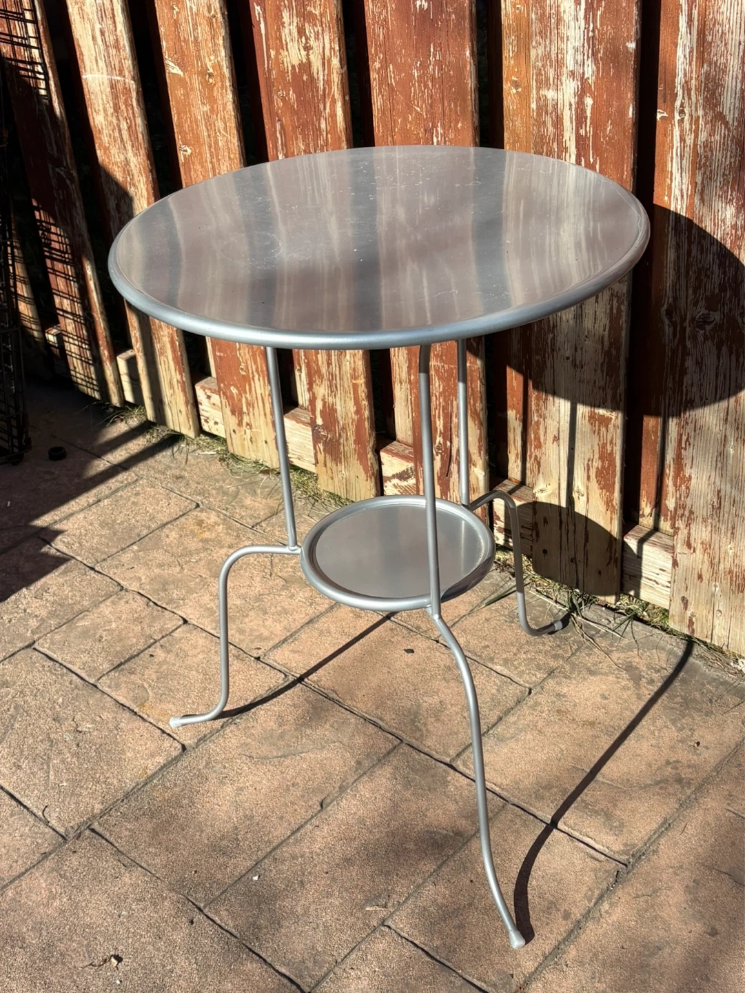 A silver-coloured round side table with a small shelf. It's made of metal and has a lightweight, airy design. Suitable for outdoor use on a patio or balcony.
