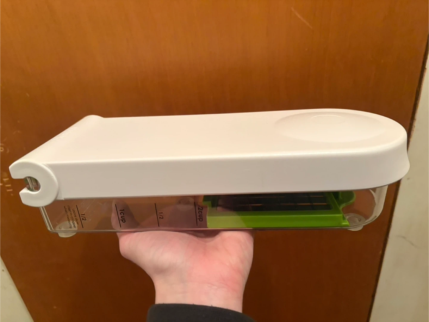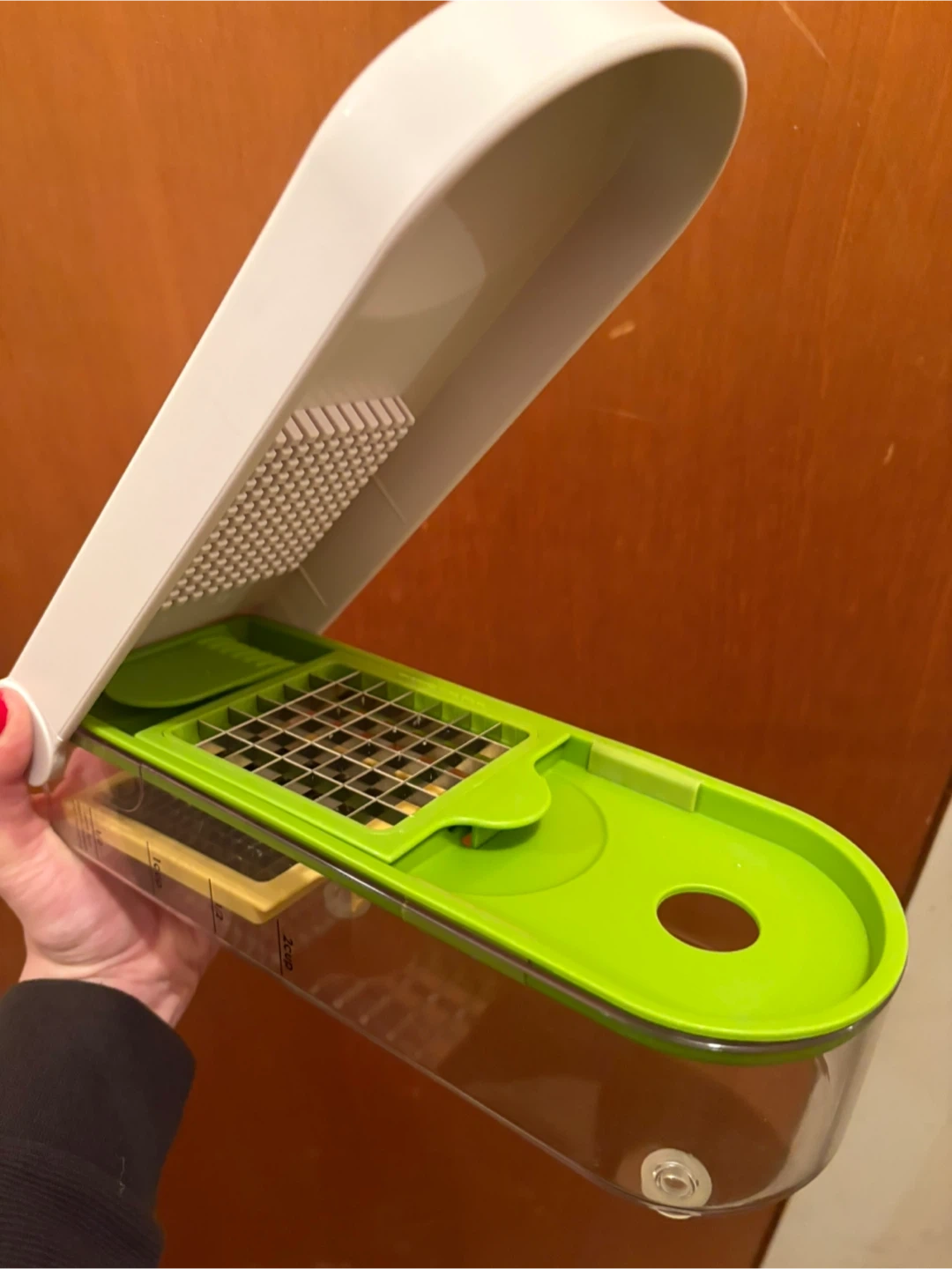 This handy kitchen gadget is for dicing and slicing vegetables. It features a stainless steel grid for precise cuts and a clear container with measurement markings. It's great for quick meal prep!