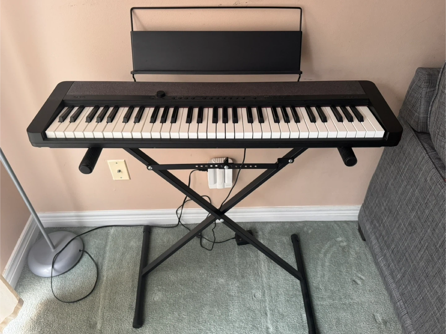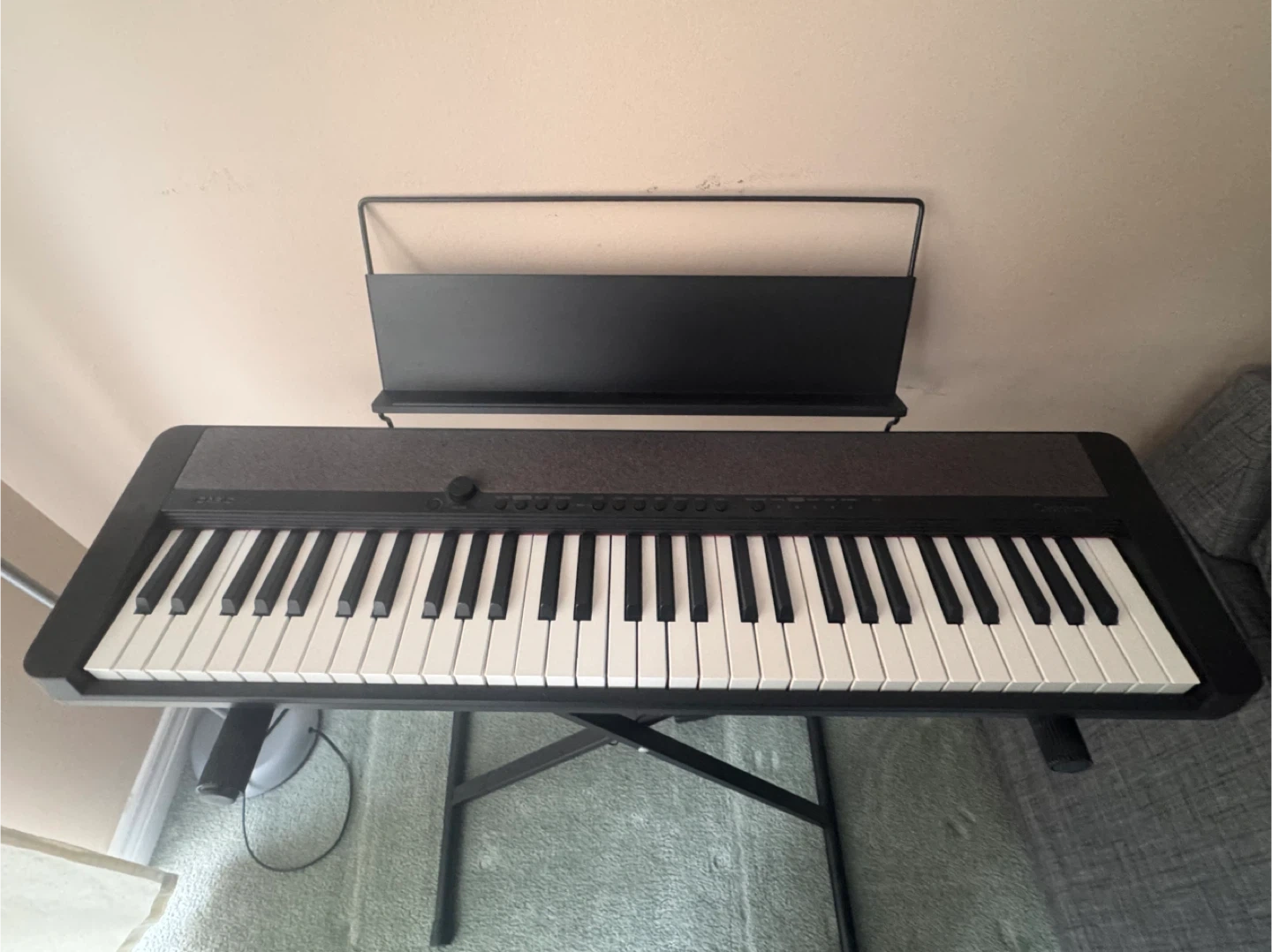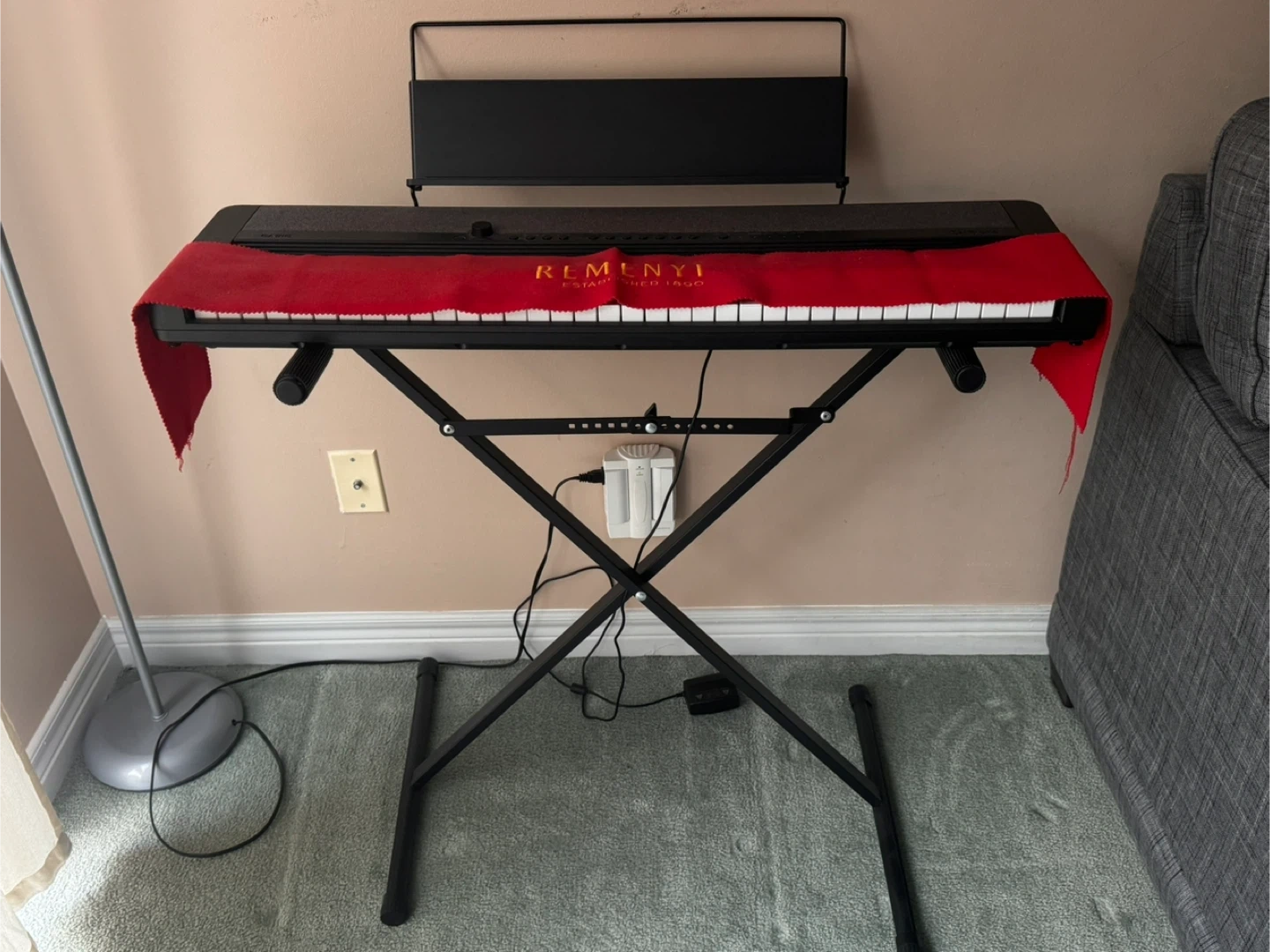 Casiotone digital keyboard on a stand. It has 61 keys and a music rest. Includes power adapter and keyboard Remenyi cover.