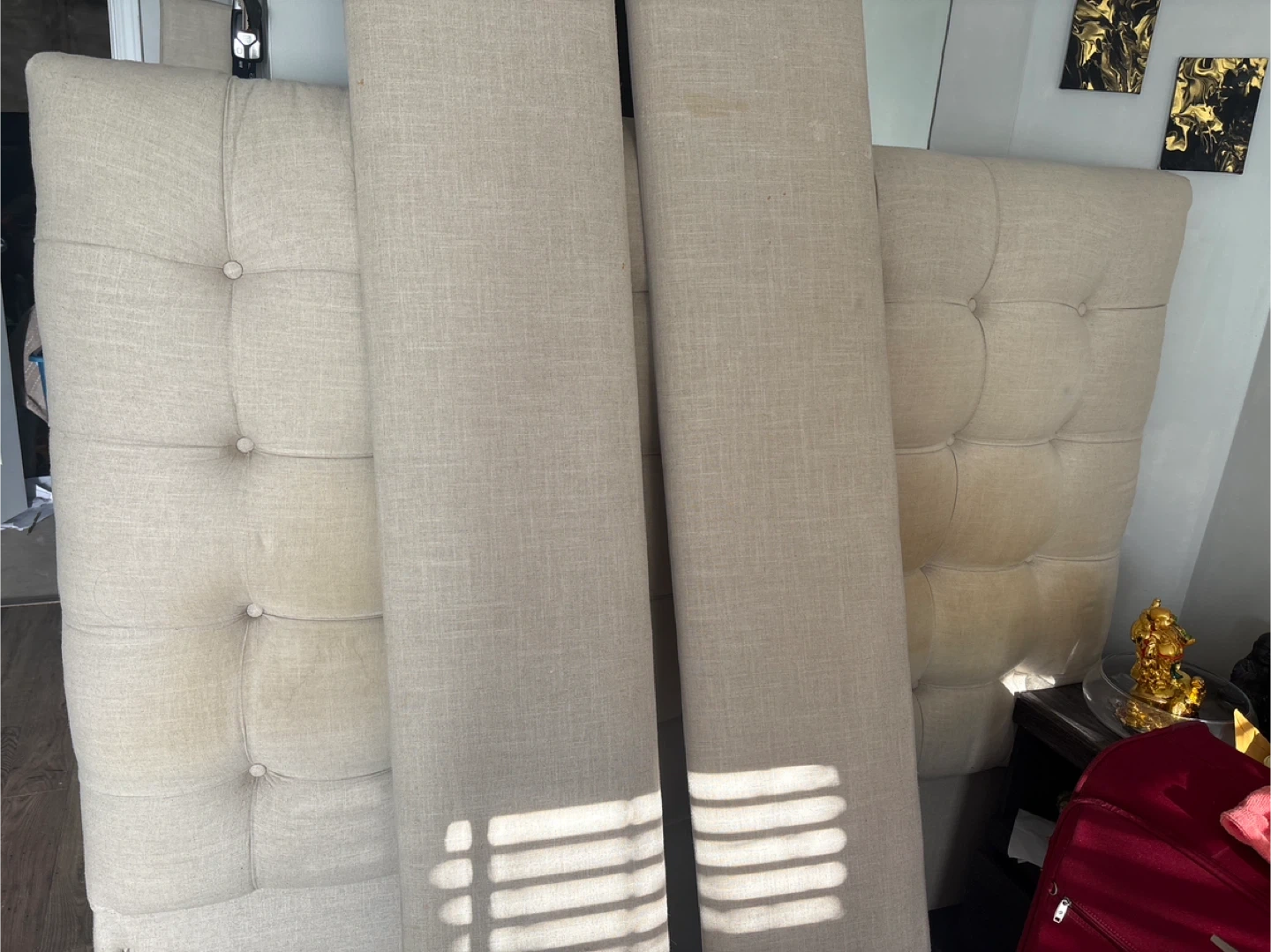 Set of tufted upholstered headboard panels in a neutral beige linen-look fabric. These panels are designed to attach to your bed frame. Adds a touch of elegance to any bedroom!