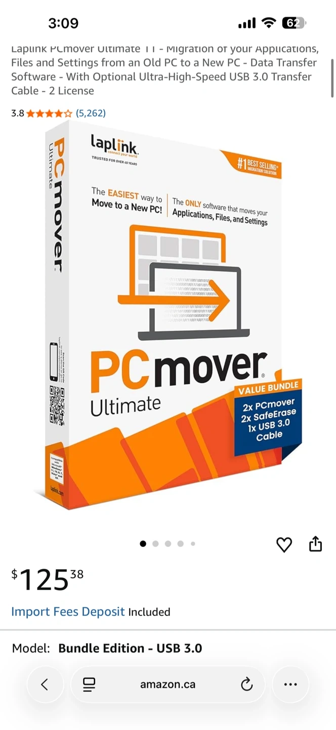 This is the Laplink PCmover Ultimate Bundle Edition, perfect for migrating applications, files, and settings to a new PC. It includes 2x PCmover licenses, 2x SafeErase licenses, and 1x USB 3.0 cable. This software is designed for easy and efficient data transfer between computers.