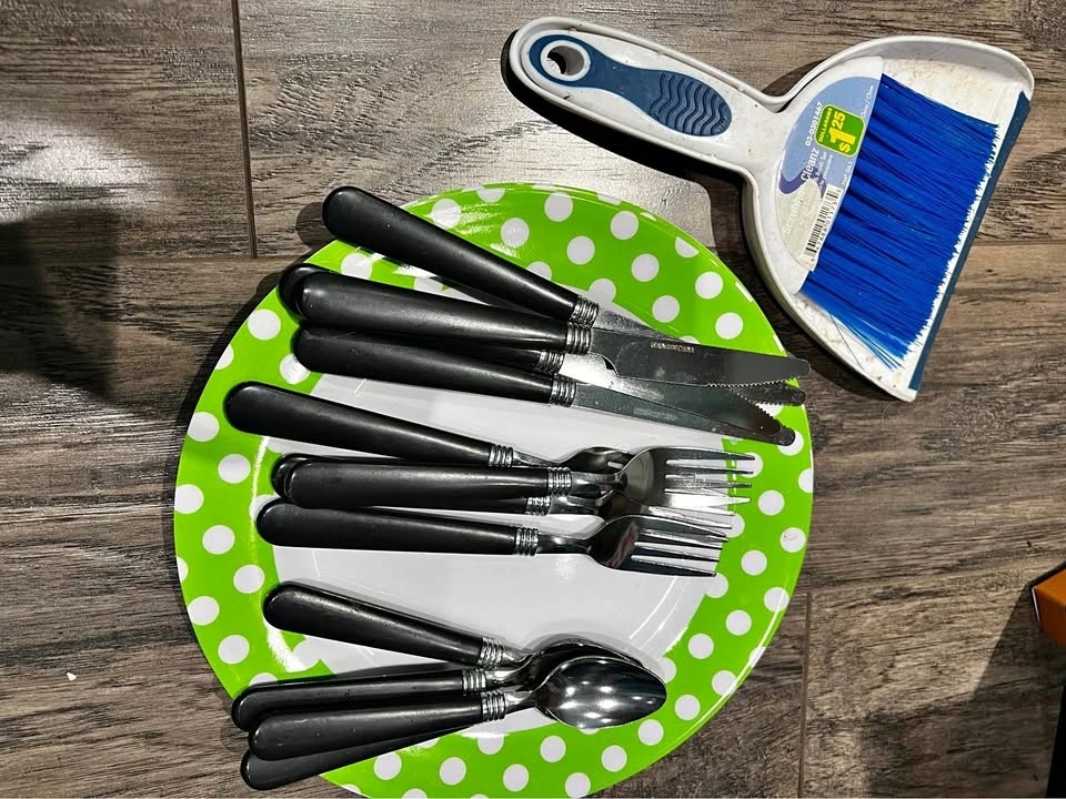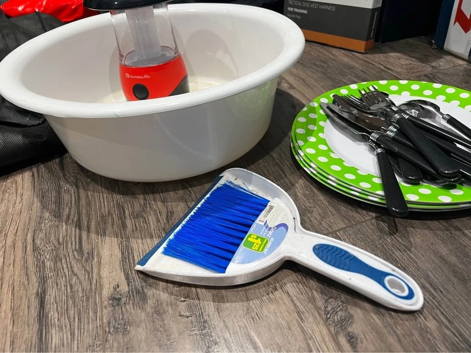 Used one time only. Set includes 4 plastic plates and cutlery for 4 (forks, knives, spoons). Also includes a mini broom and dustpan, wash basin, and mini lamp. Pick up in Keswick.