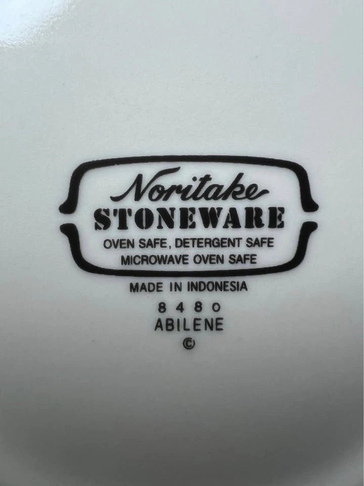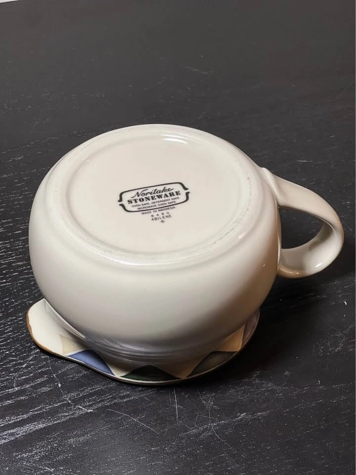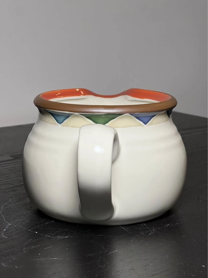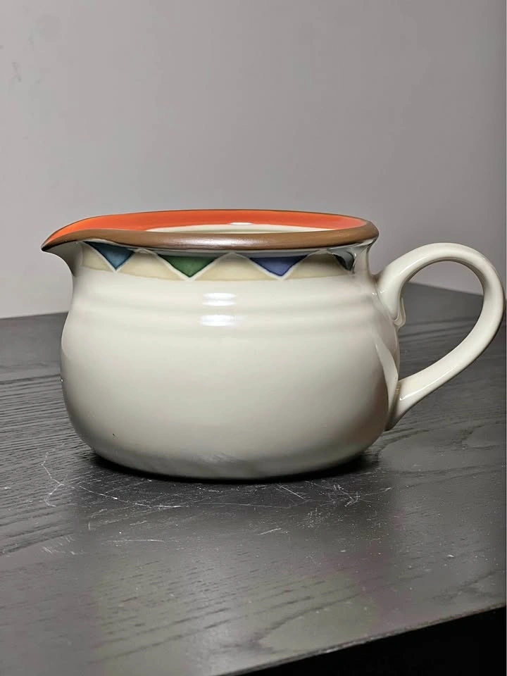 This is a Noritake stoneware creamer or pitcher from the Abilene (pattern 8480) collection. It features a distinct southwestern triangle pattern in blue, green, and beige, with a burnt umber rim. This pattern is discontinued.