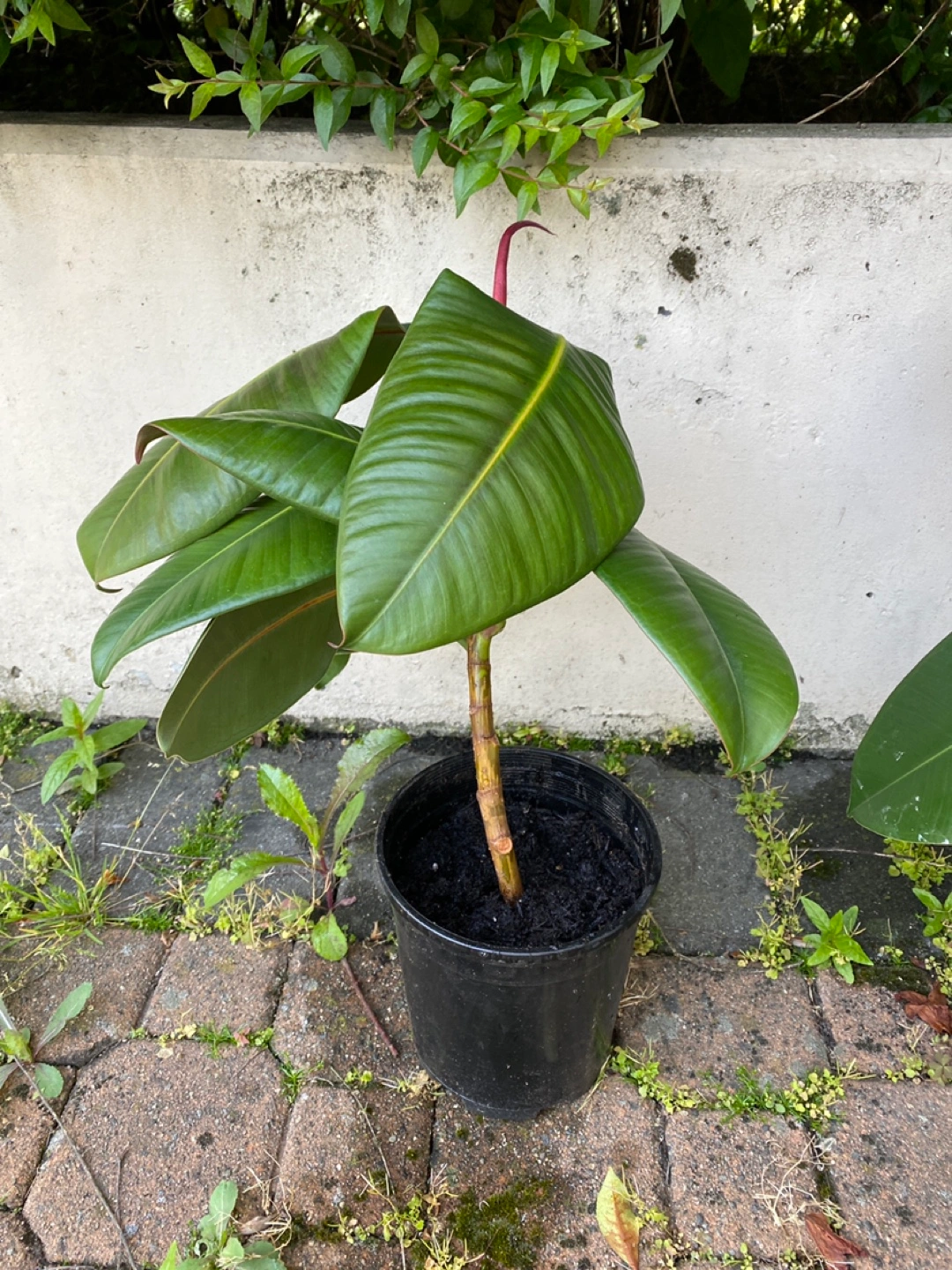 Potted with broad green leaves.