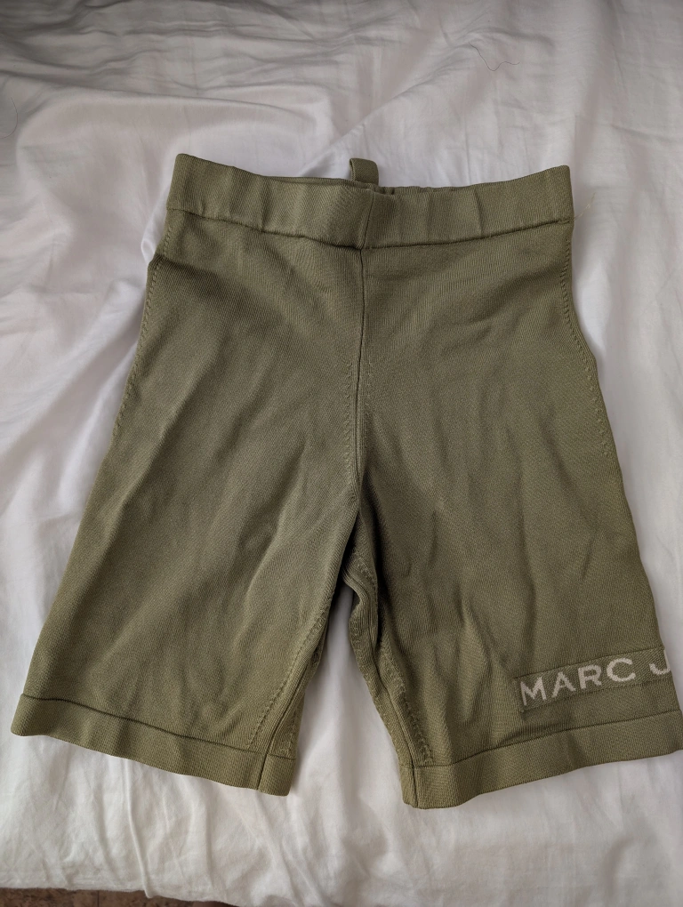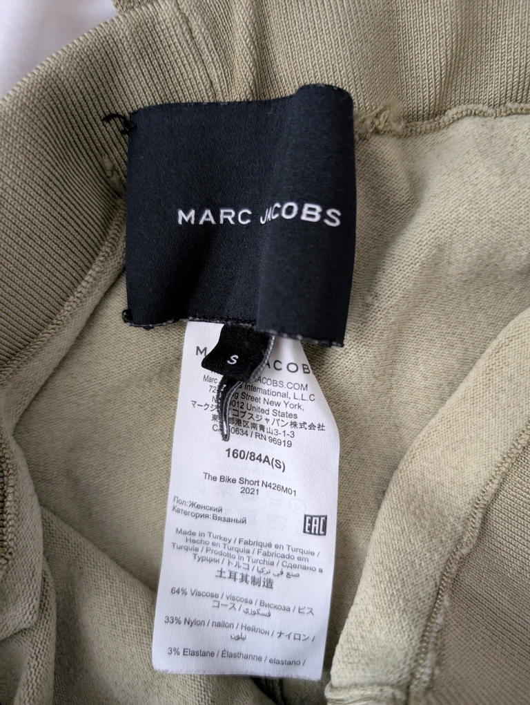These are Marc Jacobs The Bike Shorts, in size S. They're made of 64% Viscose, 33% Nylon, and 3% Elastane.