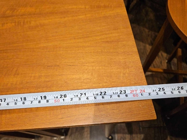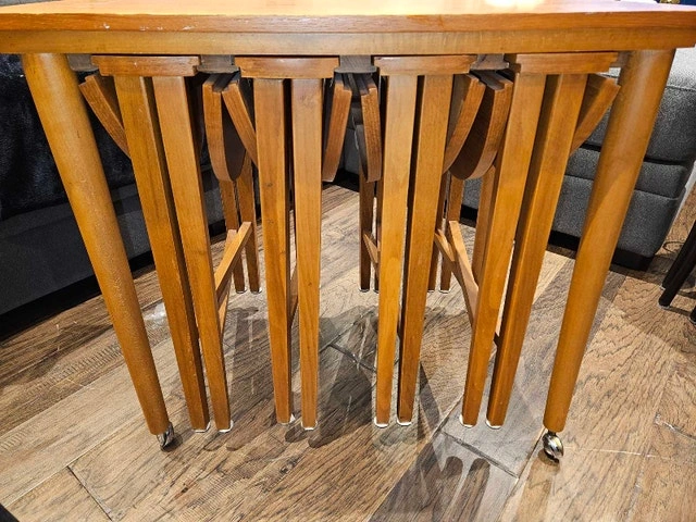 UNIQUE Rectangular - One of a Kind Teak Rectangular Host/Master Nesting Table with Wheels that Holds Four Foldable Round Nesting Tables. 4 x Round Foldable Nesting Tables. Host Nesting Table Dimensions: Deep 42 inches, Width 24.5 inches, Height 22.4 inches. Smaller Nesting Table Height: 19 inches.