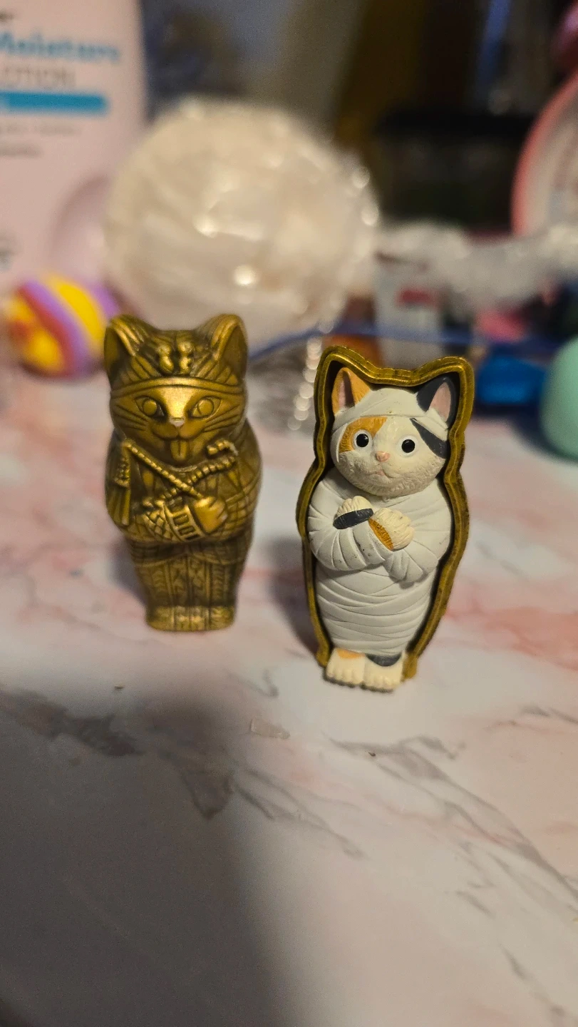 Two decorative cat figurines inspired by Egyptian mythology and mummies. One features an Egyptian pharaoh cat design in gold. The other depicts a mummy cat wrapped in bandages. Unique collectibles for display!