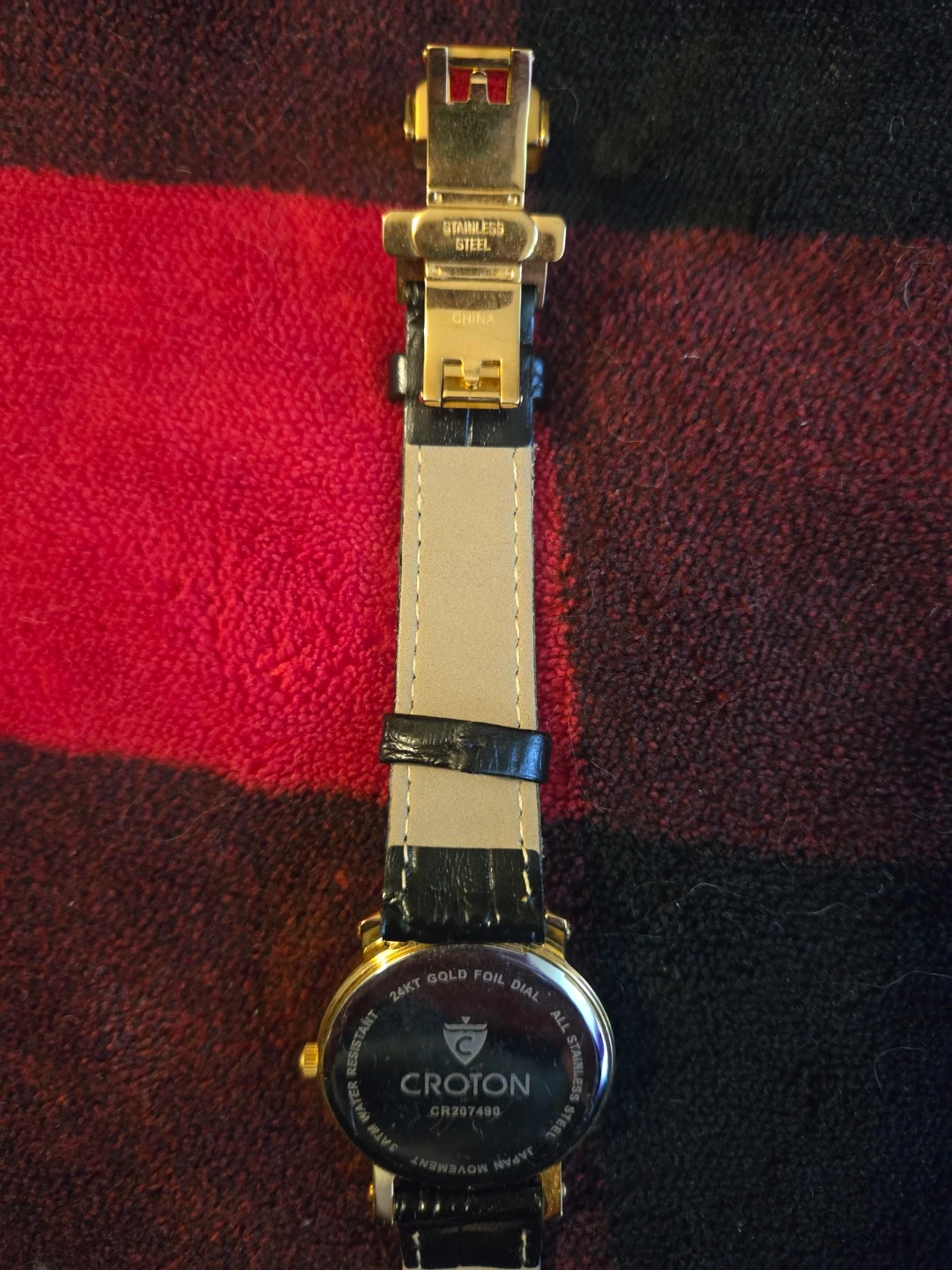 Croton quartz watch with a 24kt gold foil dial and diamond accents. It features a genuine leather band and stainless steel case. Water resistant up to 3 ATM.