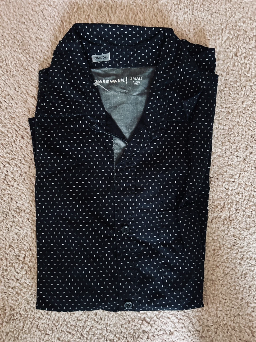 Brand new This Airwalk button-up short sleeve COTTON shirt is black with a small white polka dot pattern. It's a size small.