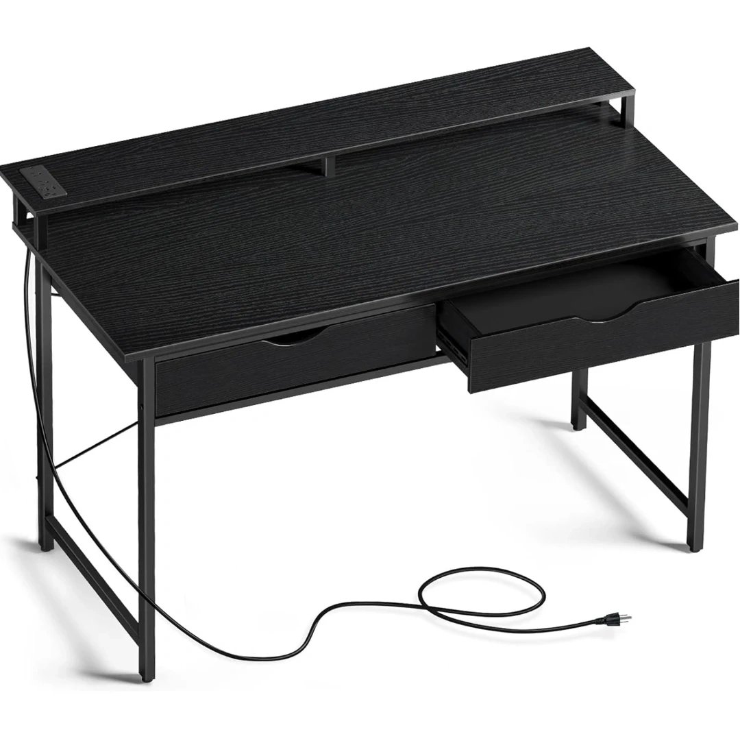 This black compact desk features a monitor riser to help with posture. The desk includes two drawers for storage and has built-in USB ports for convenience. This would be useful for a small office or a student's dorm room.