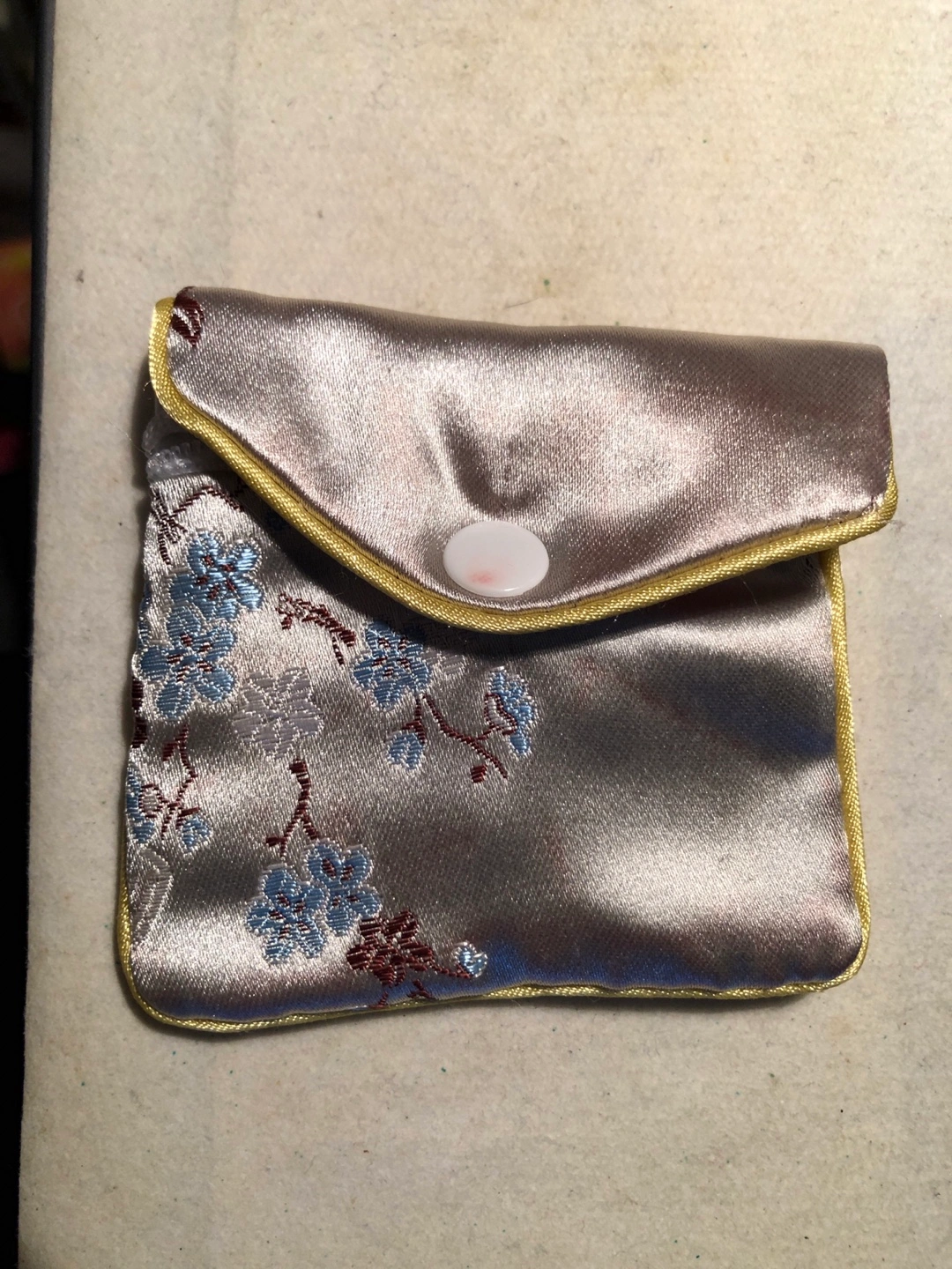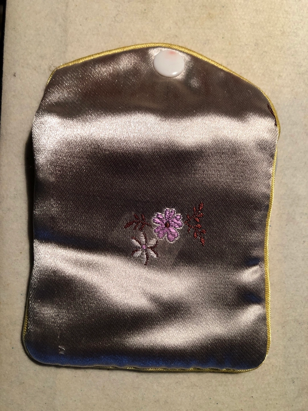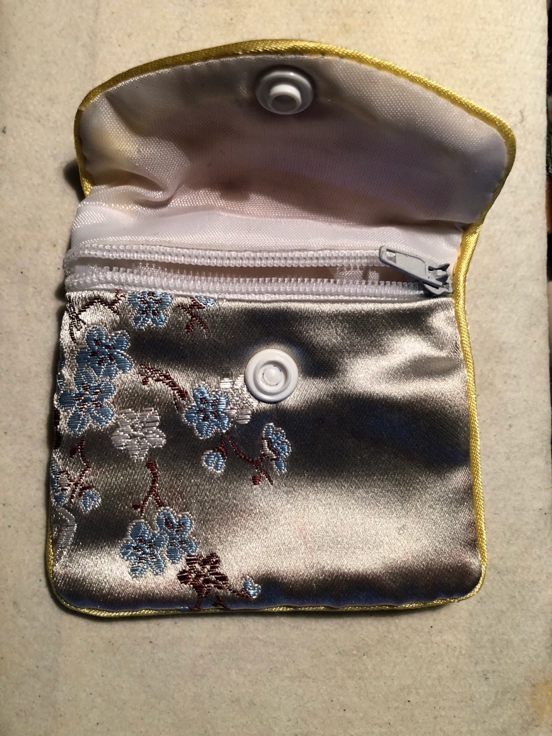 Small silk satin pouch with a floral embroidery design. Secured with a snap button closure and a zipper for extra security. Useful for carrying small items like coins or jewelry.
