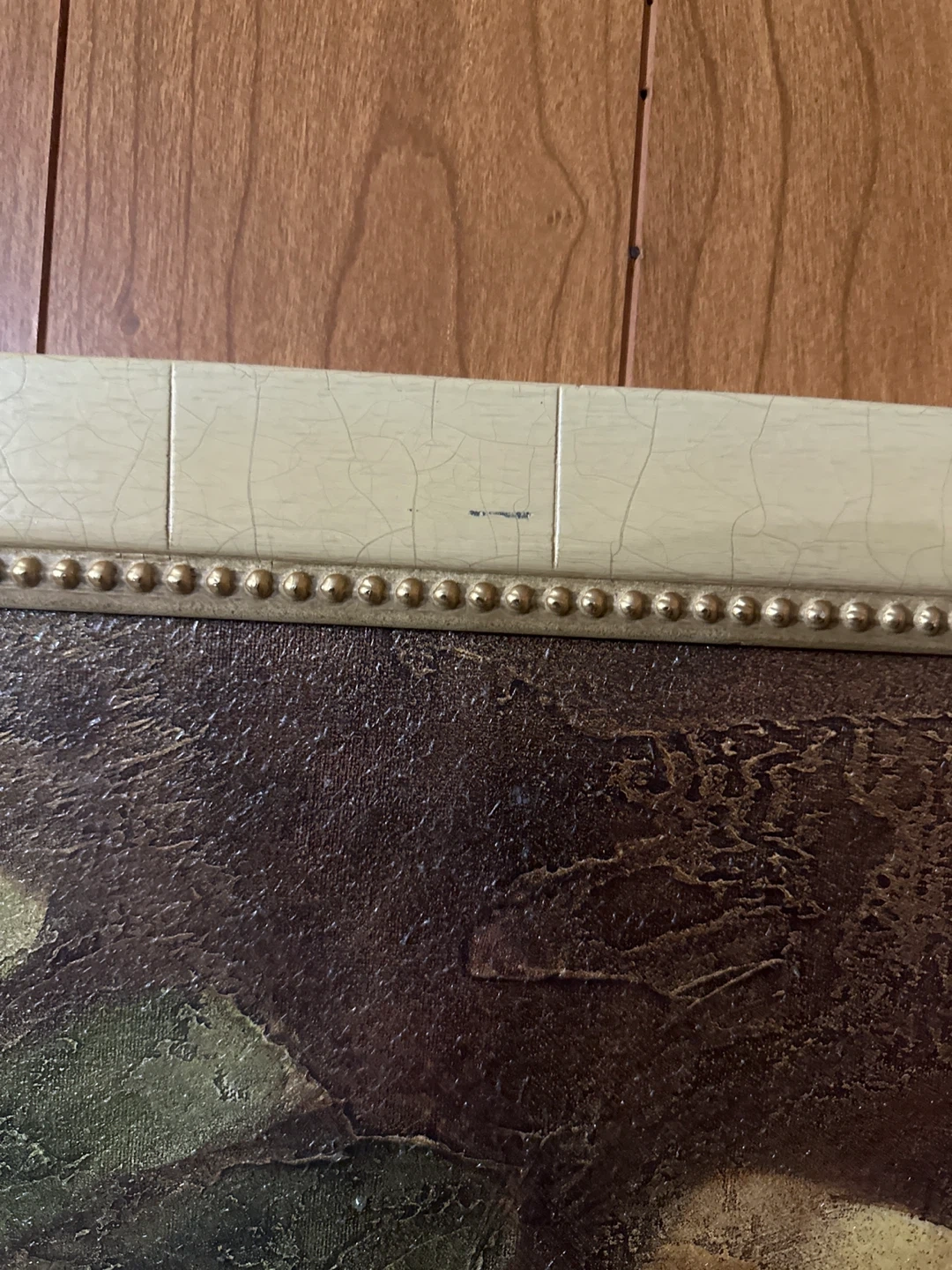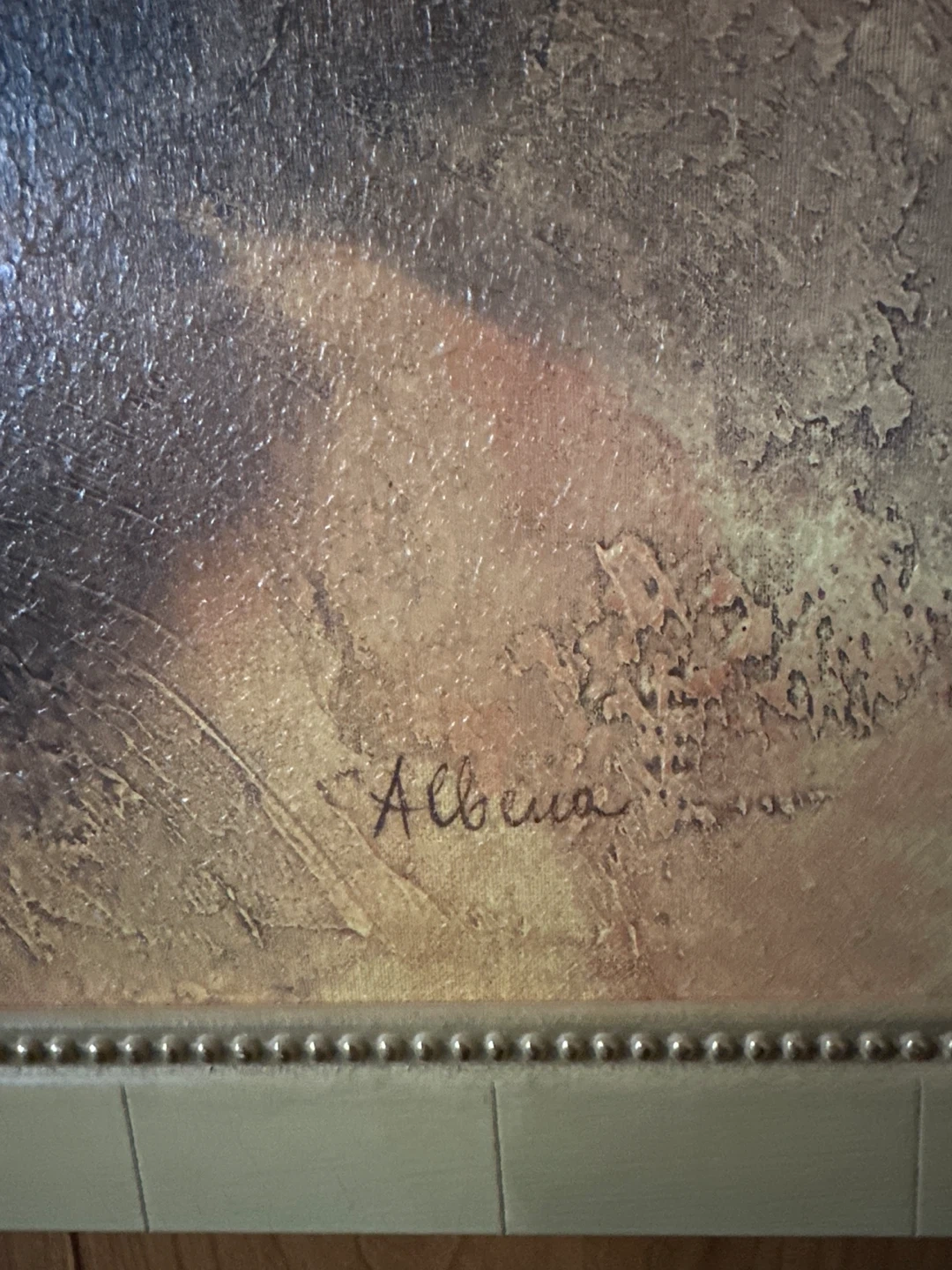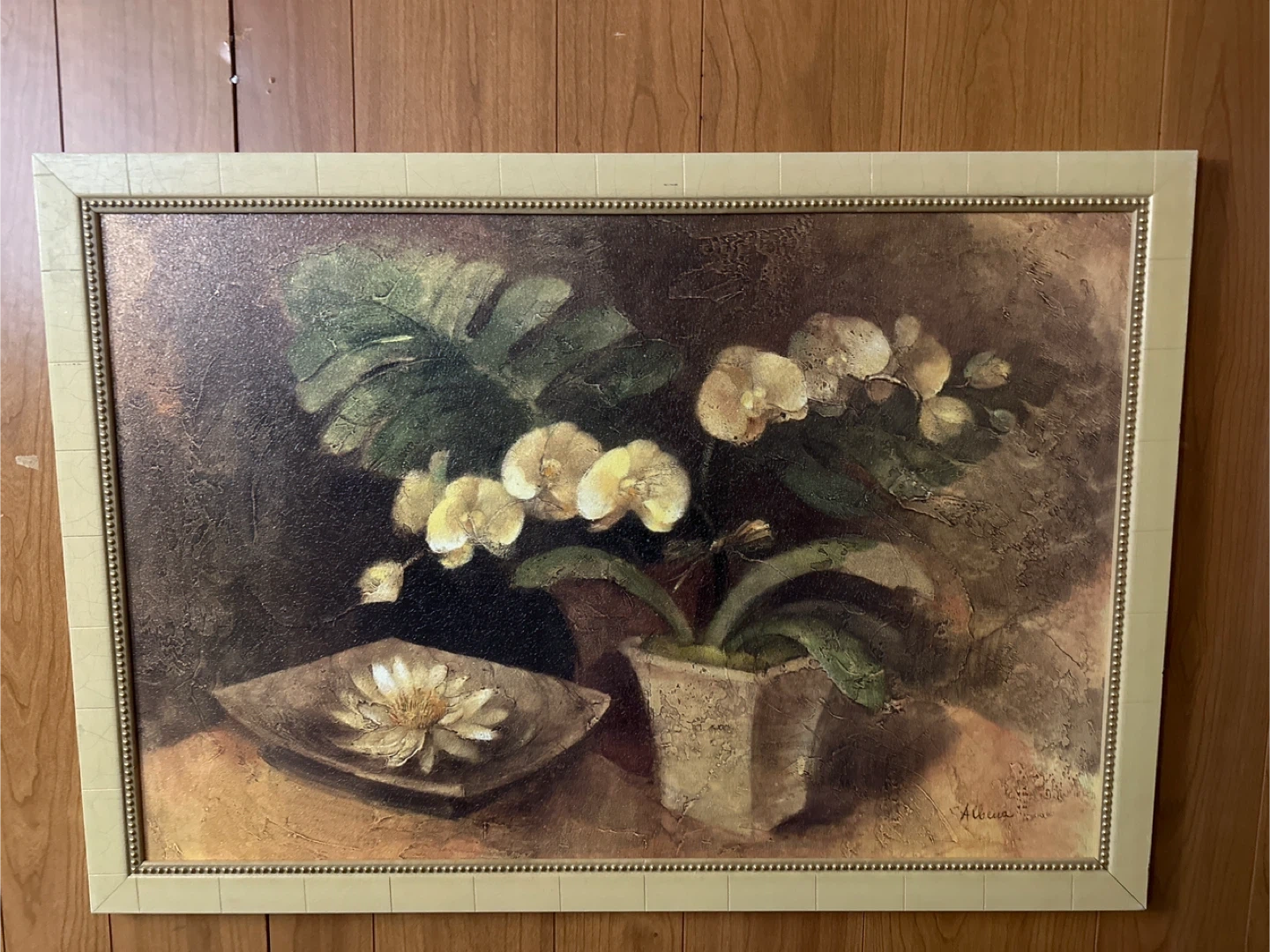 Beautiful floral painting signed by Albena. It features a lovely arrangement of orchids and other greenery in a decorative pot and bowl. The frame is a light cream colour with a beaded inner edge. It would look great in any room!
