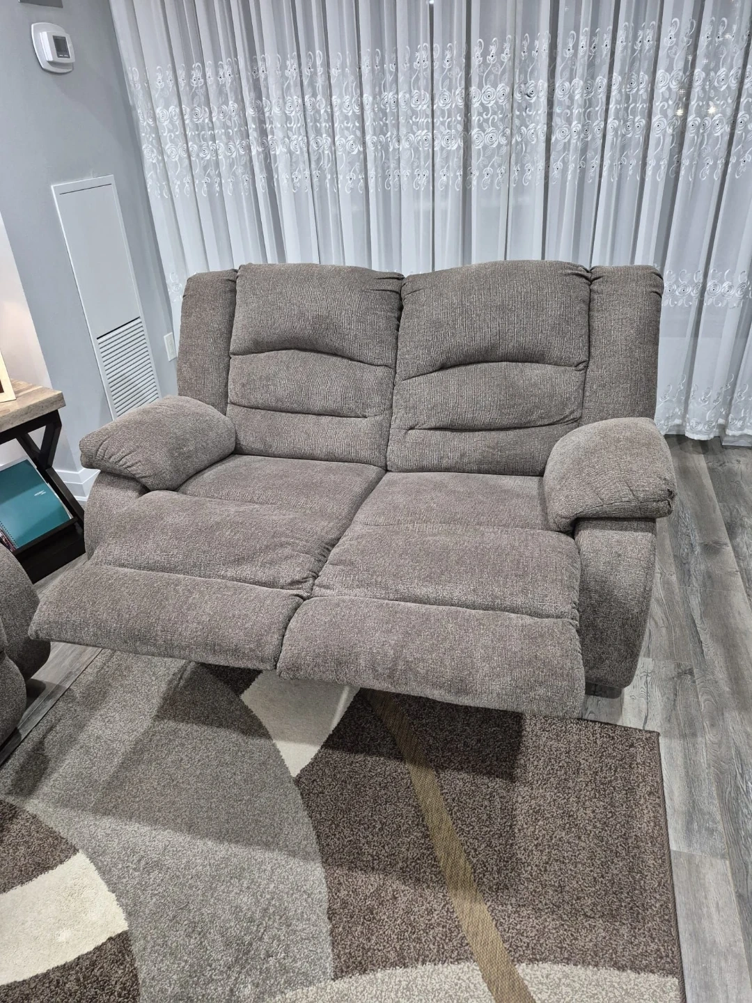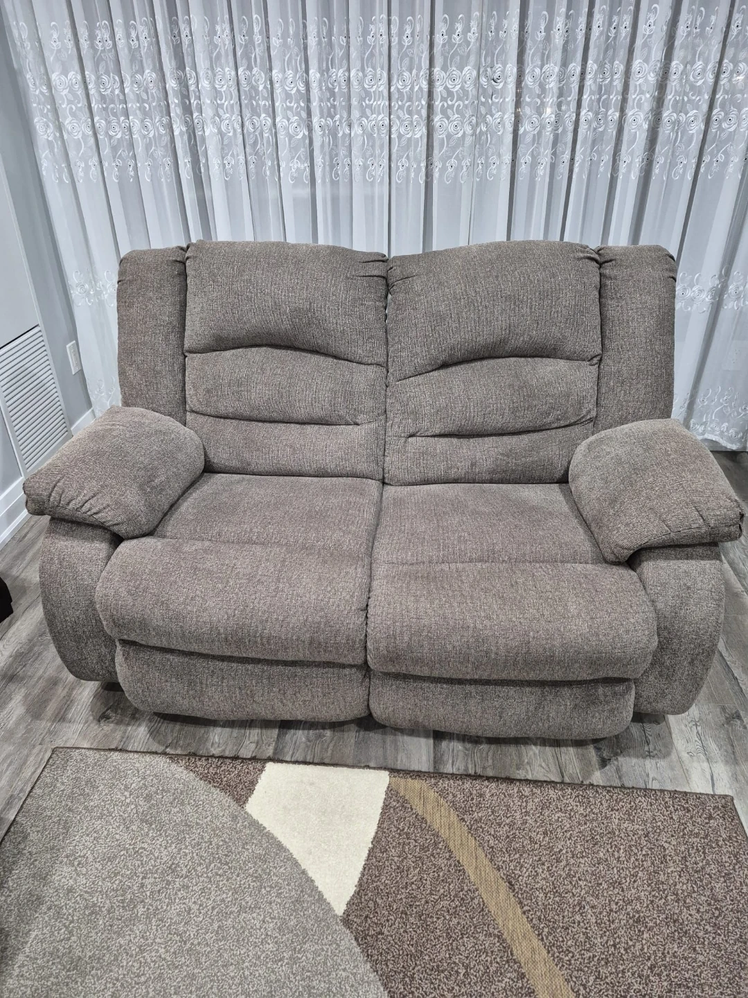 This is a comfortable grey fabric reclining sofa. It features plush cushions and a sturdy frame for durability. Both sides recline for extra relaxation! From Ashley Furniture. Smoke free. Pet free. 5rs old. Selling for a friend. Pickup near Square One. $600 for both.